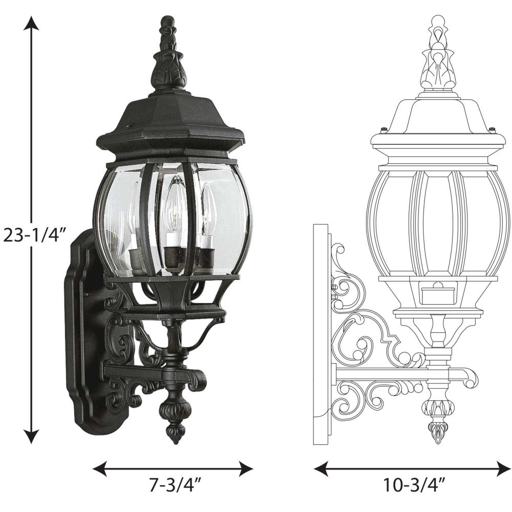 Detailed finials, end caps and scroll work in a durable power coat finish, featuring clear beveled glass panels and cast aluminum frames. Three-light wall lantern.