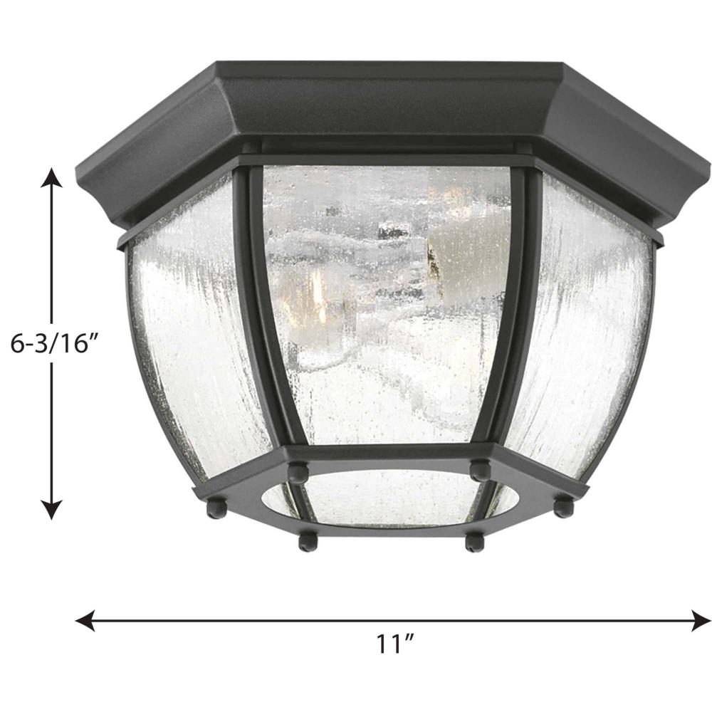 Solid two-light flush mount in rich weathered finish is complemented by seeded glass panels - a great choice for low maintenance and years of enjoyment. Black finish.