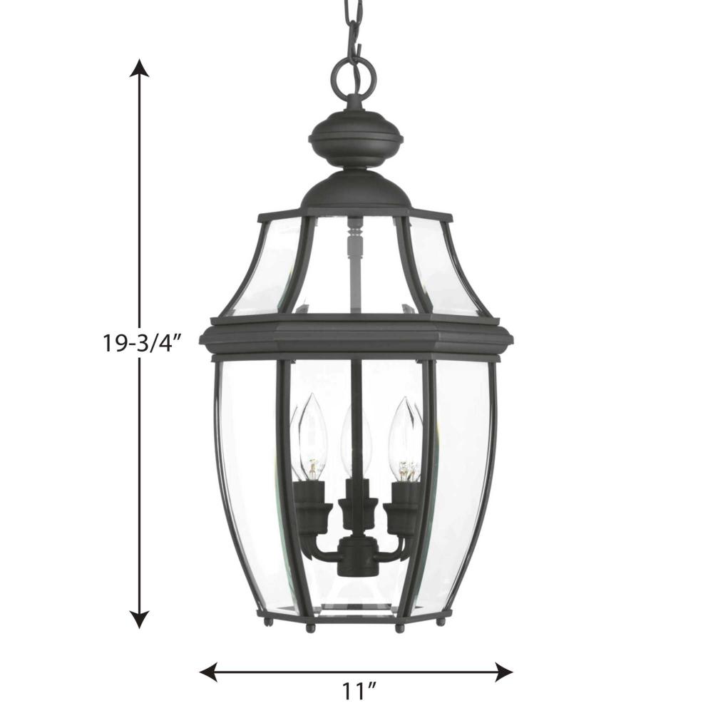 A Black finish complements clear beveled glass in the New Haven outdoor hanging lantern. Durable aluminum construction. Open bottom design allows easy access to replace lamps without removing any pieces. Post, hanging and wall options are available.