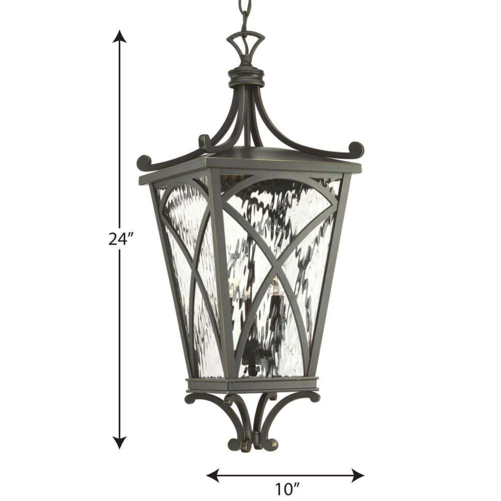 The Cadence three-light hanging lantern showcases classic styling with clear water glass panels and traditional lighted clusters. Mediterranean-style frame is finished in Oil Rubbed Bronze. This Design Series collection has four lantern sizes, hanging lantern and post lantern.
