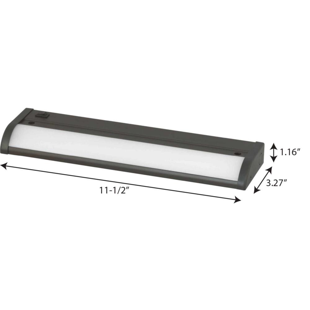 12" linear undercabinet fixture;Antique Bronze powder coat finish;Extruded aluminum construction;Angled lens design to ensure proper illumination;Integral ON/OFF switch;Dimmable to 10% with many Forward Phase (Triac) or Electronic Low Voltage (ELV) dim