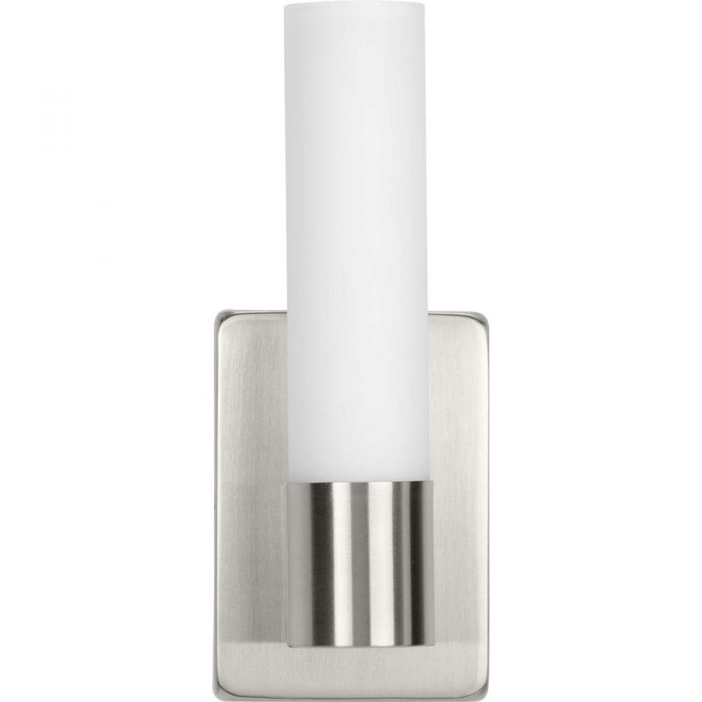 This LED Wall Bracket Highlights Classic Forms With Crisp, Contemporary Updates. An Understated Brushed Nickel Backplate Holds A Smooth, Modern Light Base. Within The Light Base Stands A Cylindrical Etched Glass Shade That Evokes Images Of Candlesticks.