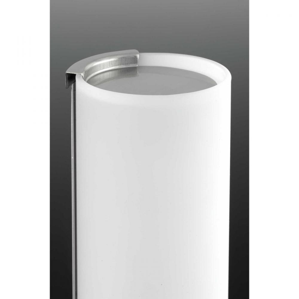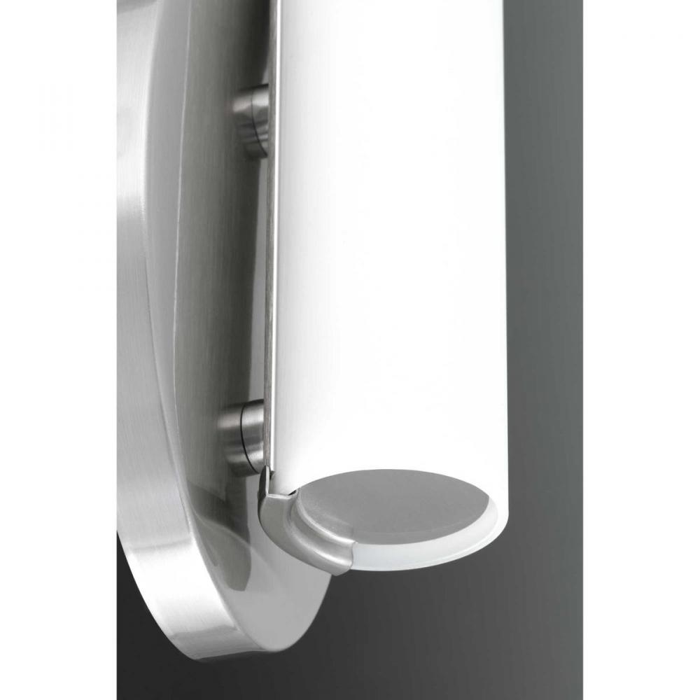 Parallel LED vanity and sconces feature a tubular opal glass diffuser paired with a simple, modern metal canopy. An integrated LED source provides a variety of energy and cost savings benefits. Suitable for residential and commercial applications. Brushed Nickel finish.