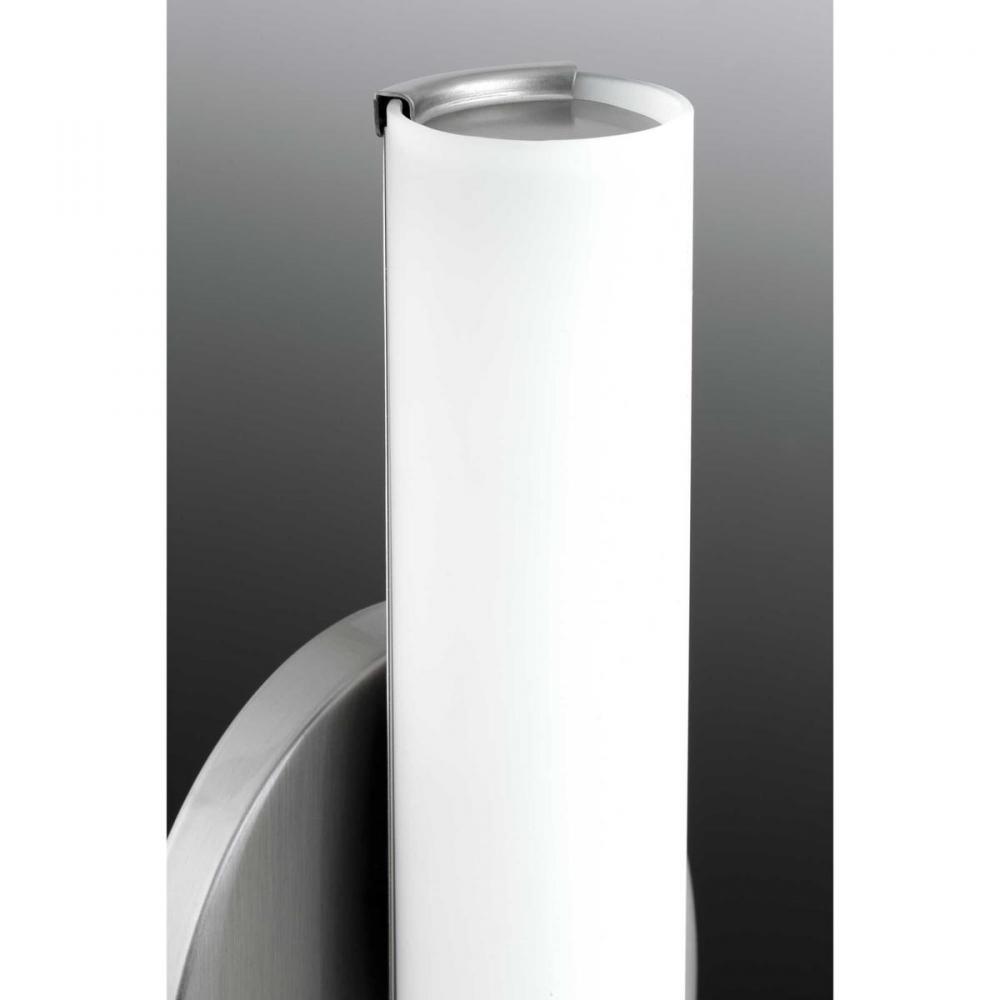A cylindrical design pairs with an oval back plate to create a harmonious design;11" linear 16-watt LED wall bracket;Etched white glass;Brushed Nickel finish;Integrated LED source provides a variety of energy and cost savings benefits for the homeowner