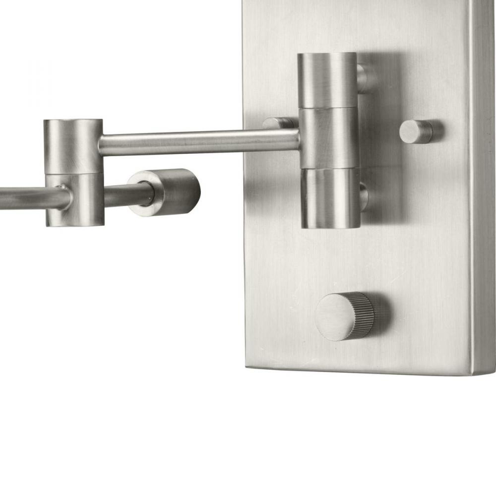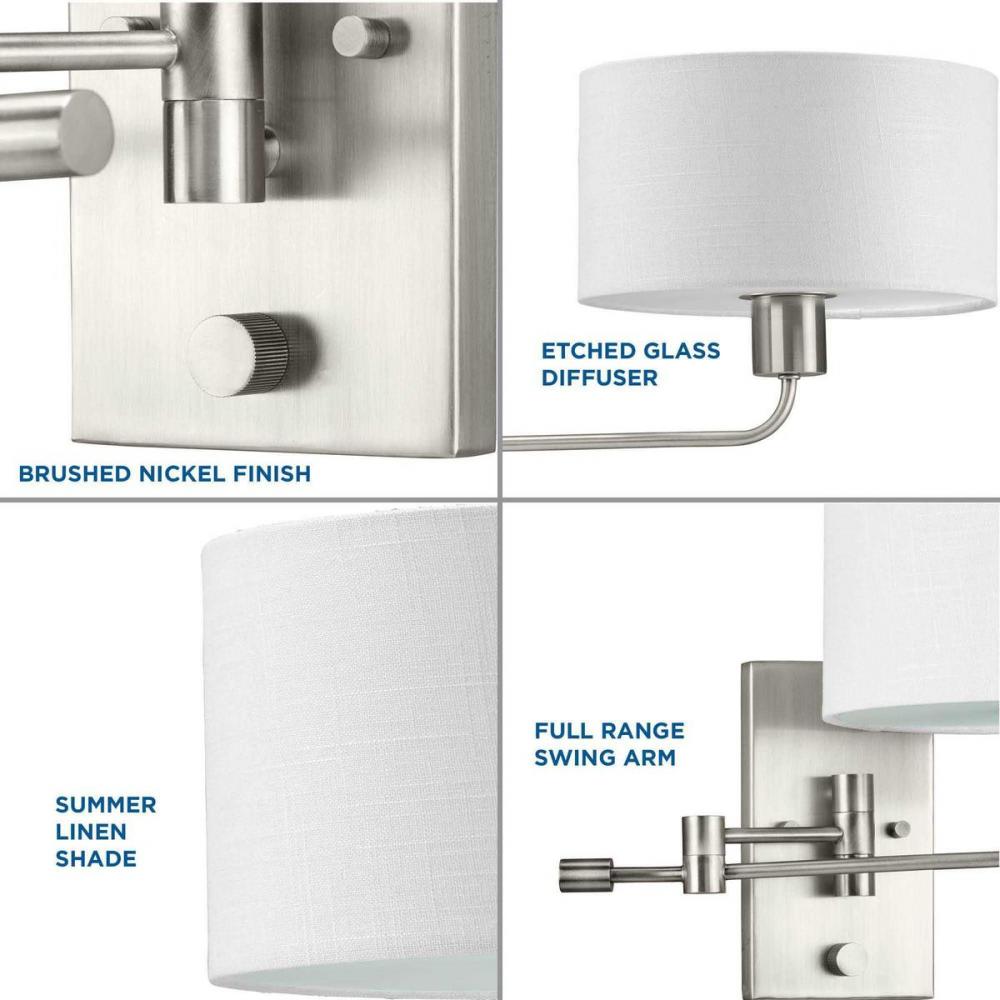 Merge function and fashion with the Carrick Collection. A full-range swing arm supports a crisp summer linen shade and etched glass diffuser for glare-free task illumination. An integral rotary switch on the backplate is included for convenient control. The wall light's frame is coated in a beautiful brushed nickel finish.