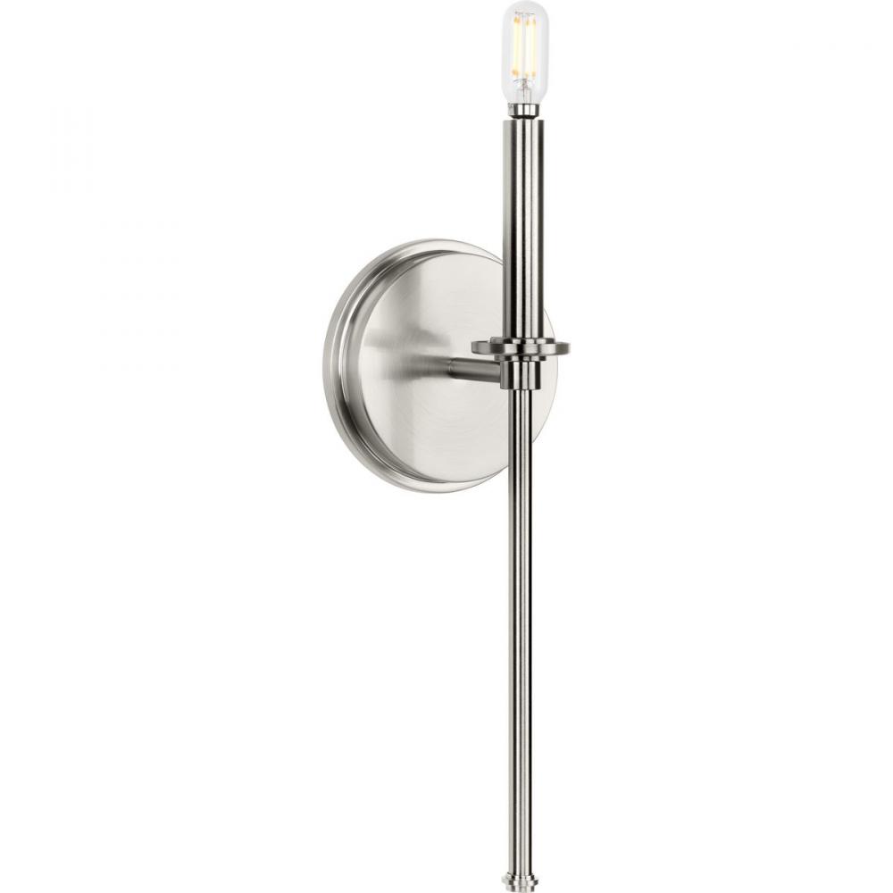 Feature a chic form with a bath vanity light from the Elara Collection. The slender frame with a stylized finial inspired by chess pawns is coated in a beautiful brushed nickel finish. For additional customization, Elara can be topped by a tapered or drum fabric shade or a clear glass cylinder.