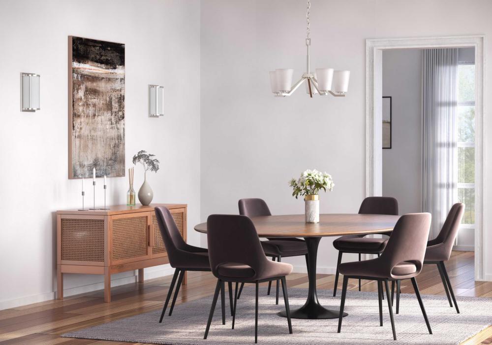 The fixture's sophisticated design elevates contemporary and new traditional settings