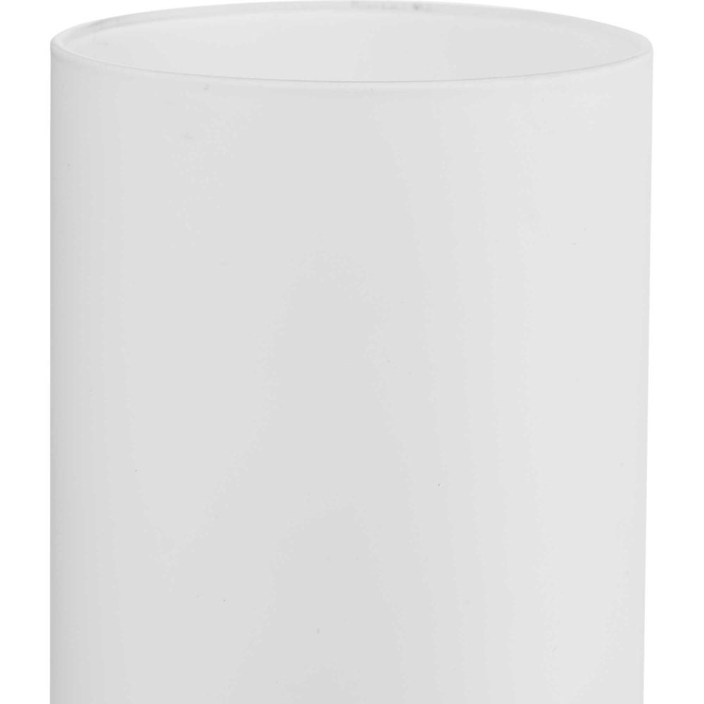 A simple round mounting plate holds a lamp bases light surrounded by an elegant etched white cylindrical shade allowing illumination from the glowing light source within