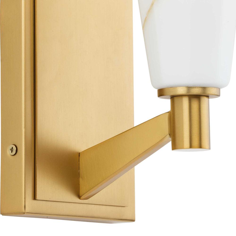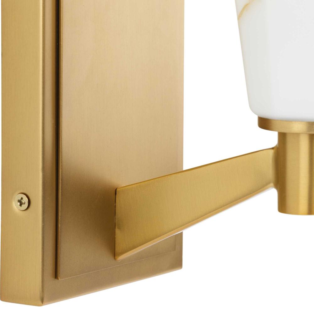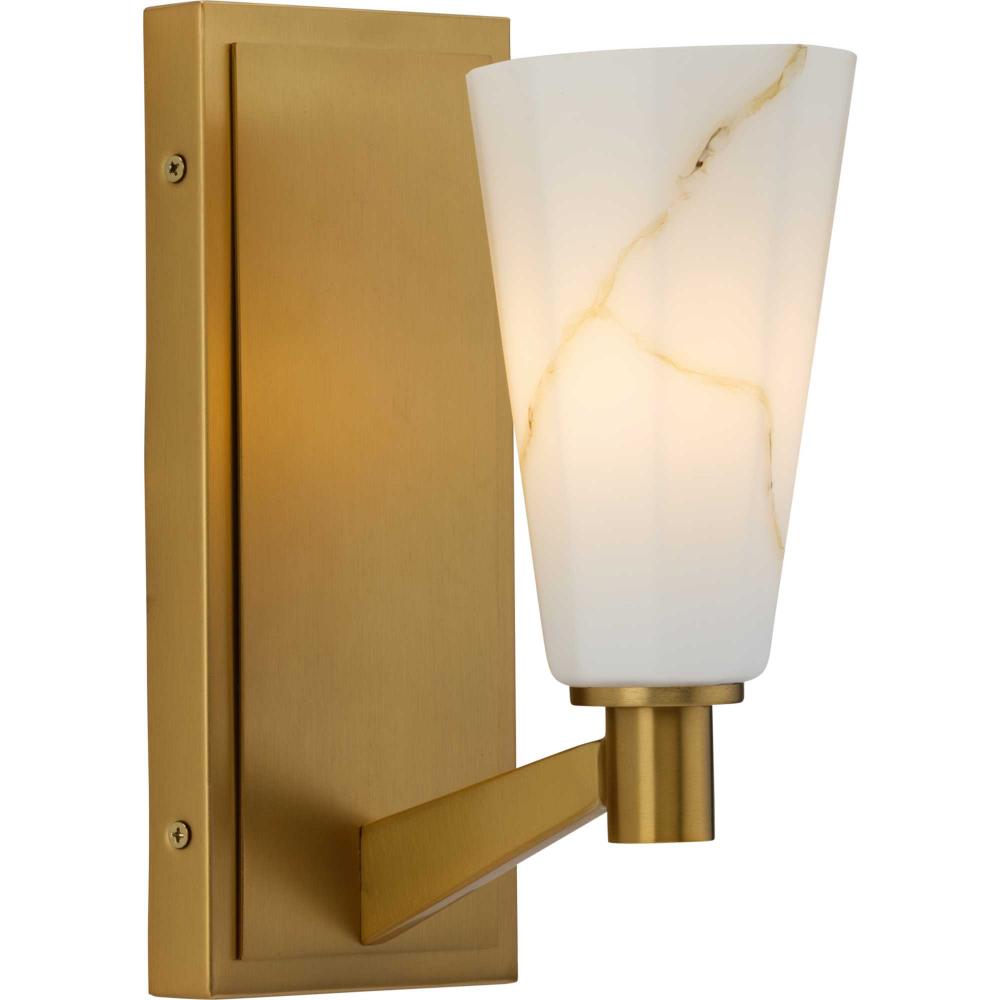 The Tosca Collection exudes a sense of motion from a gracefully tapered arm that transcends traditional design boundaries. The Brushed Bronze wall light holds a geometric glass shade crafted with a faux alabaster finish that radiates patterns of light and shadow, adding depth and warmth that enchant any room. This fixture is part of the Progress Lighting Design Series, a lighting collection offering fashionable styles and luxury lighting for the home.