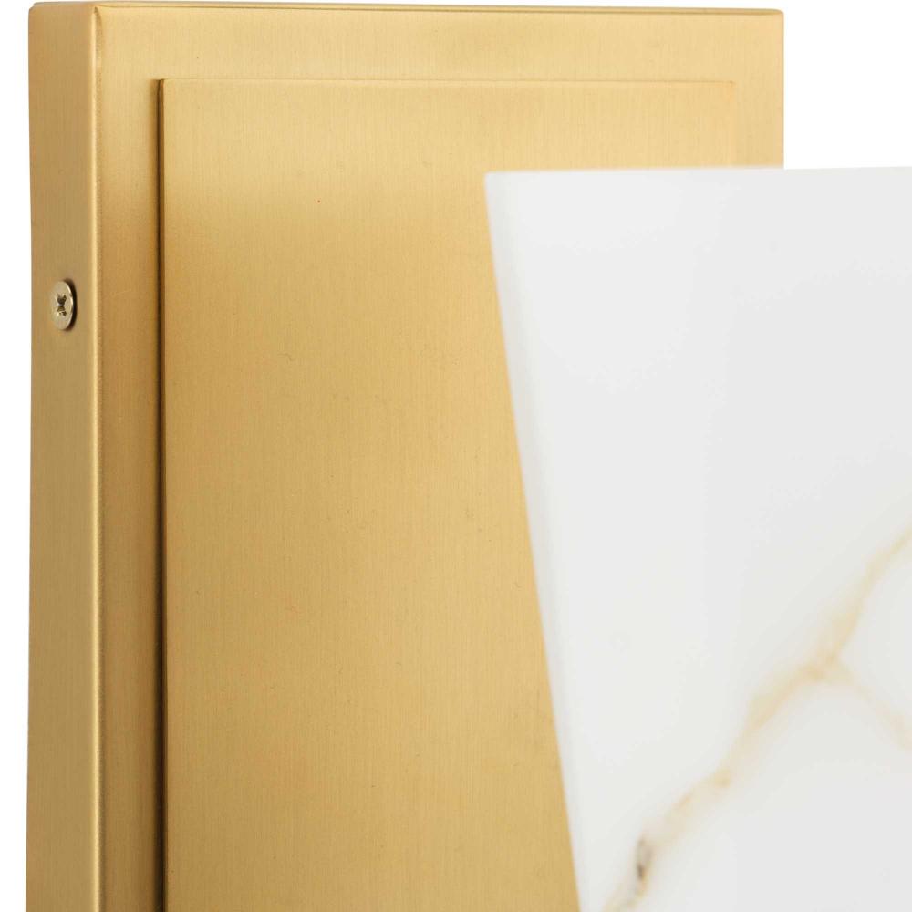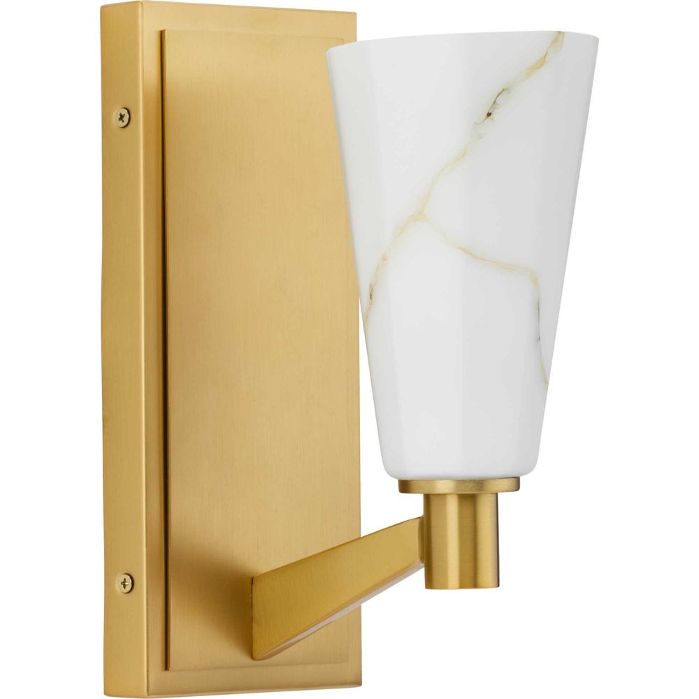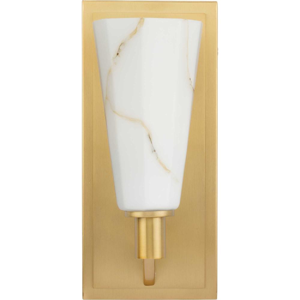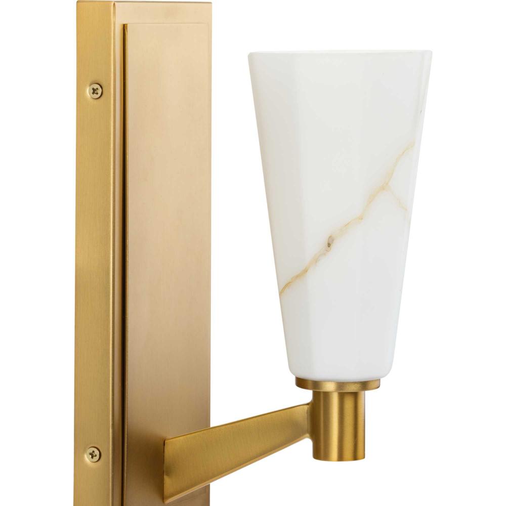 The Tosca Collection exudes a sense of motion from a gracefully tapered arm that transcends traditional design boundaries. The Brushed Bronze wall light holds a geometric glass shade crafted with a faux alabaster finish that radiates patterns of light and shadow, adding depth and warmth that enchant any room. This fixture is part of the Progress Lighting Design Series, a lighting collection offering fashionable styles and luxury lighting for the home.