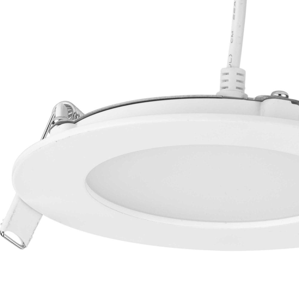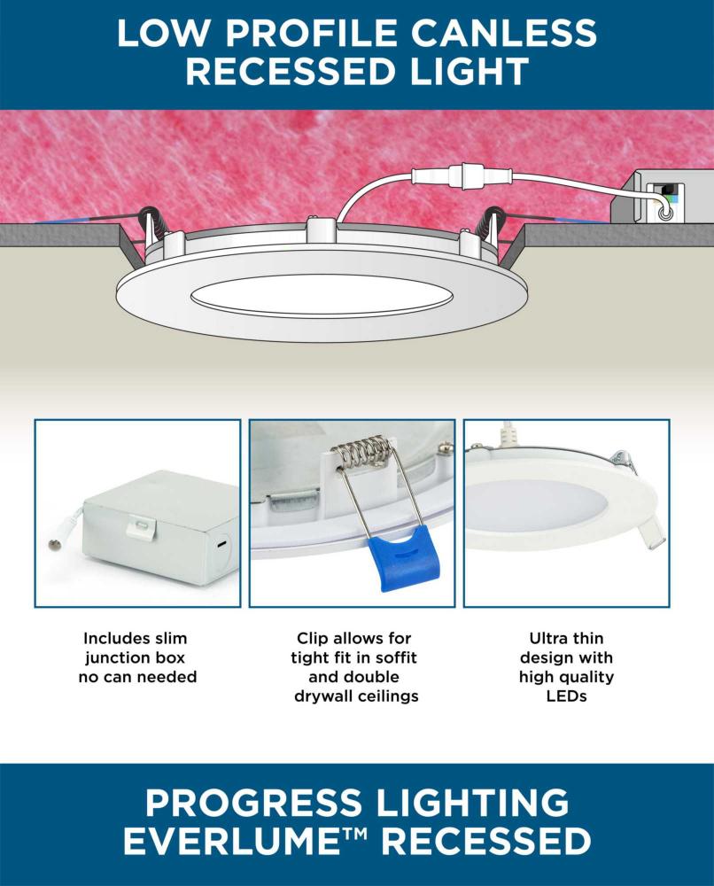 With a slim profile and the latest LED technology, the 4-inch Everlume Recessed Downlight offers smooth, even 3000K illumination to homes and commercial spaces. Its edge-lit surface delivers low glare, 10W, 825 lumen light without dark spots from a polycarbonate lens and is dimmable using ELV or TRIAC dimmers. Its aluminum trim is finished in crisp Satin White that blends quietly into its surroundings. A detached J-Box, provided with quick connects, eliminates the need for an additional recessed housing. The trim features a gasket to close off the ceiling opening. Additionally, spring clips ensure a secure flush mount to the ceiling surface. Everlume recessed LED is easily installed into 4-inch openings in low clearance, new construction and remodel, ceiling applications. This versatile downlight is Energy Star Rated, JA8-2019 Title 24 Rated, and cCSAus Wet Listed for use in areas where water may be present.