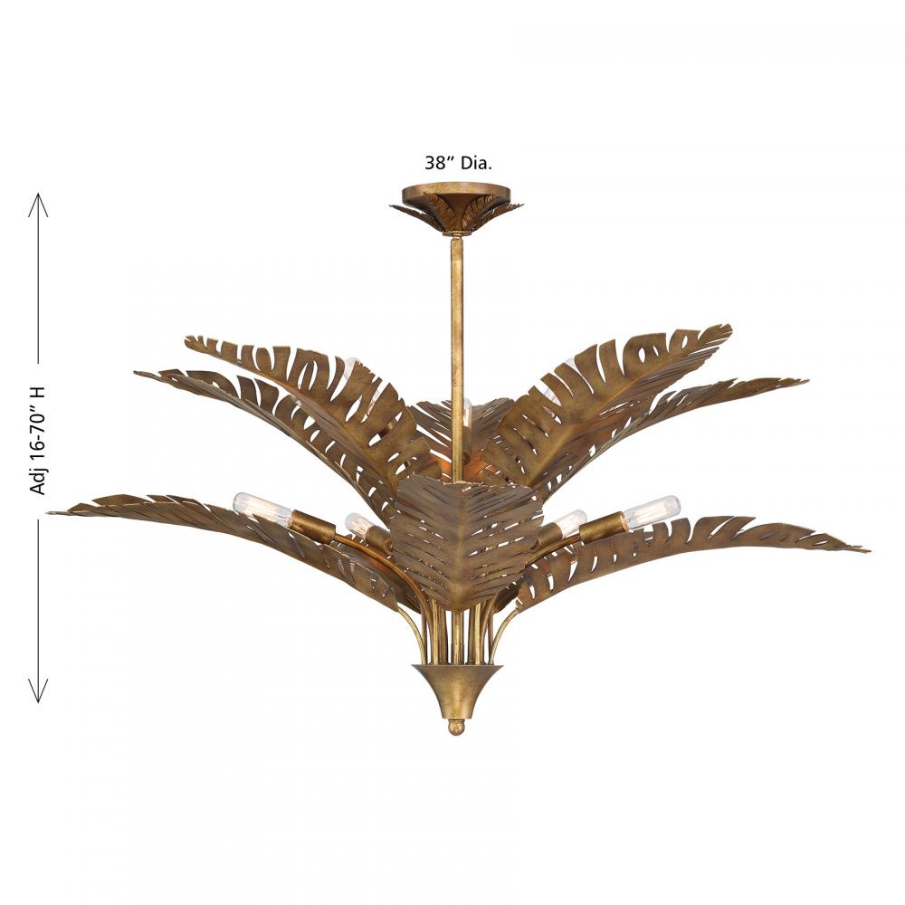 The spectacular Savoy House Palmera 10-light pendant was designed by award-winning interior designer and TV host Breegan Jane. Palmera reimagines the decadent, opulent palm leaves of the iconic Bel Air Hotel in an elegant way, becoming the perfect blend of Breegan's love for brass and her California roots. A highly textured Gold Vein finish adorns the intricate palm leaves, adding richness and depth. Palmera is 38" in width and has an adjustable height ranging from 16" to 70". It uses ten candelabra size bulbs of up to 60 watts per bulb. Bulbs not included. Comes with four 12" downrods and one 6" downrod.