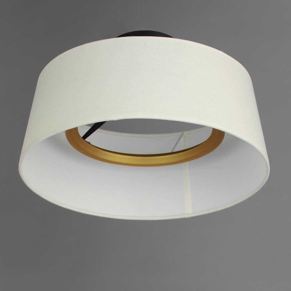 Truncated tapered cones of linen shades diffuse light from an LED ring within them. The LED lighting offers ample illumination that is softly diffused behind the shade. A two-pronged fork detail supports the ring within further modernizing this transitiona