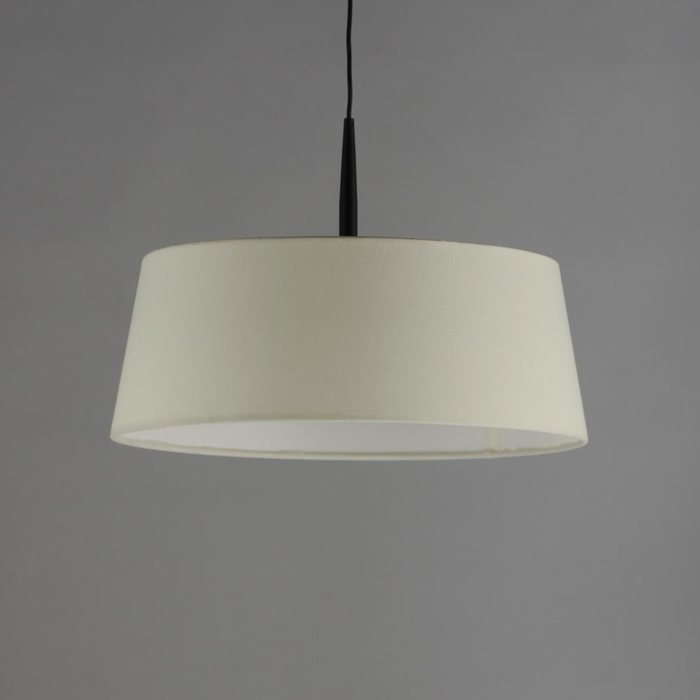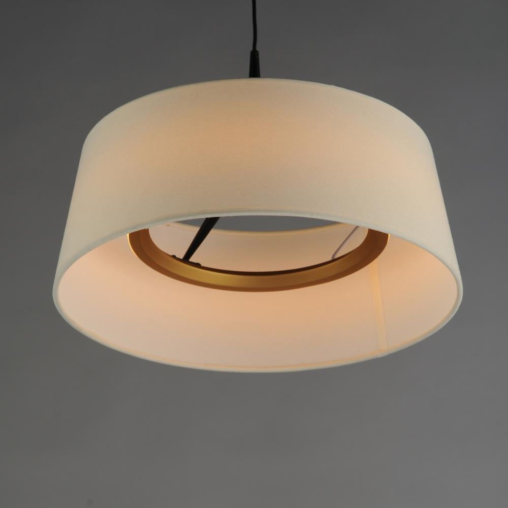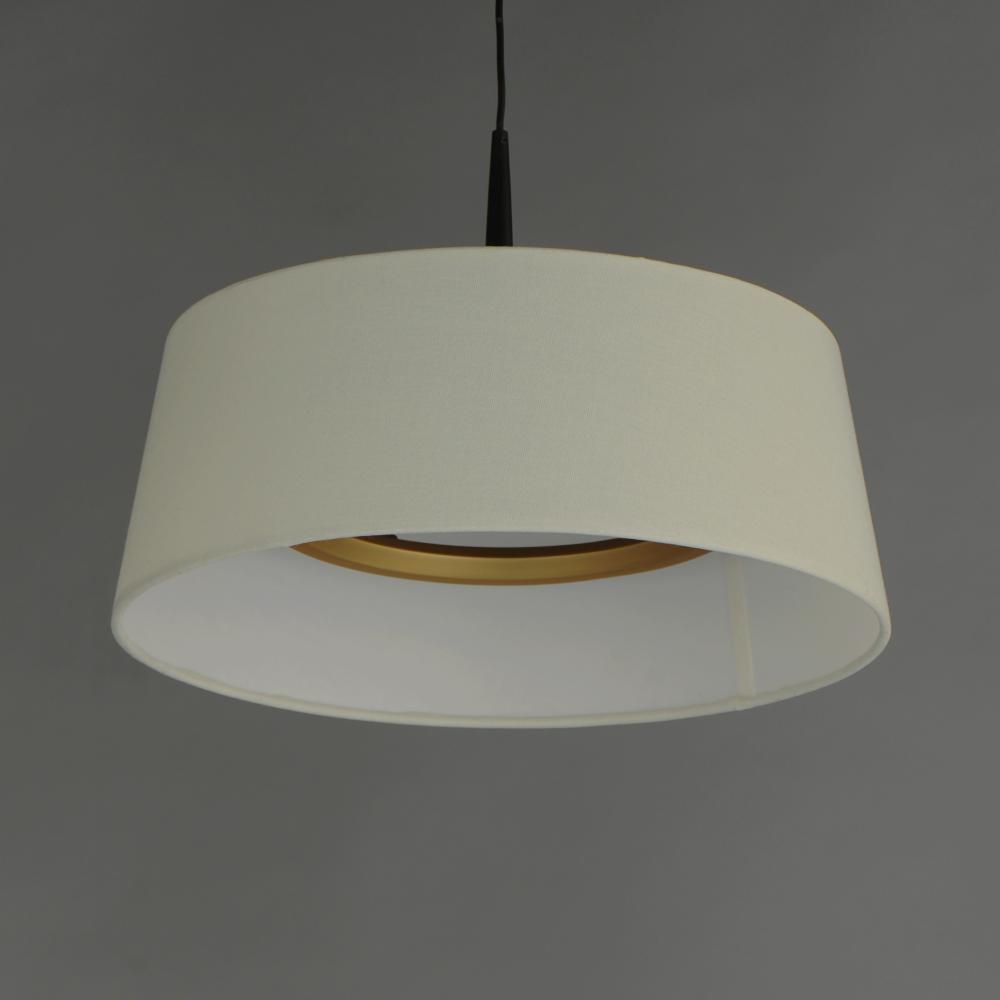 Truncated tapered cones of linen shades diffuse light from an LED ring within them. The LED lighting offers ample illumination that is softly diffused behind the shade. A two-pronged fork detail supports the ring within further modernizing this transitiona