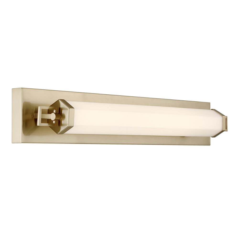 The Savoy House Parker bath vanity light blends vintage inspiration with modern LED brilliance, creating a look that feels familiar and fresh. A faceted hexagonal tube of white opal glass houses an integrated LED light source, offering beautifully even illumination. Thoughtful metal detailing brings subtle geometric charm while the Noble Brass finish introduces welcoming warmth and richness. Parker is 4.5" in height, 28" in width and extends 4.5" from the wall. This bath vanity light is damp area rated. The integrated LED light source has a 3000K color temperature.