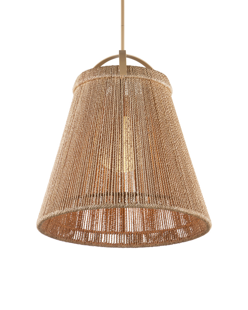 The Parnell Medium Natural Pendant resembles a bell made of natural Kraft Paper twine that is painstakingly double-wrapped on both the outside and the inside of the wrought iron frame in a beige finish. A frosted white glass globe holds the one light, which is dimmable, within the textured shade that flares to 24 inches in diameter at the bottom. Adjustable from 32.75" to 74.75" with use of included chain/rod kit/cable. If your space calls for a longer drop, additional chain/rods/cable is available for purchase.