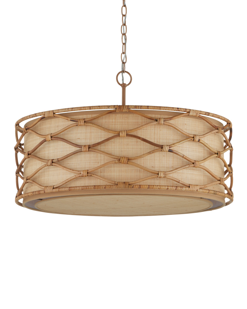 The Partita Pendant is a natural material story through and through. The illumination is softened from the sides and the bottom by grasscloth that shows off its subtle texture when the light filters through it. Surrounding the shade is a rattan pattern that flows elegantly without seeming to begin or end. The process to create this ornamentation is painstaking, as the rattan is steamed and bent by hand, then bound together with thin bands of the same material. to be consistent with the overall color of the other elements, the wrought iron frame and hardware on the pendant are finished in a saddle tan. Adjustable from 24.5" to 92.5" with use of included chain/rod kit/cable. If your space calls for a longer drop, additional chain/rods/cable is available for purchase.