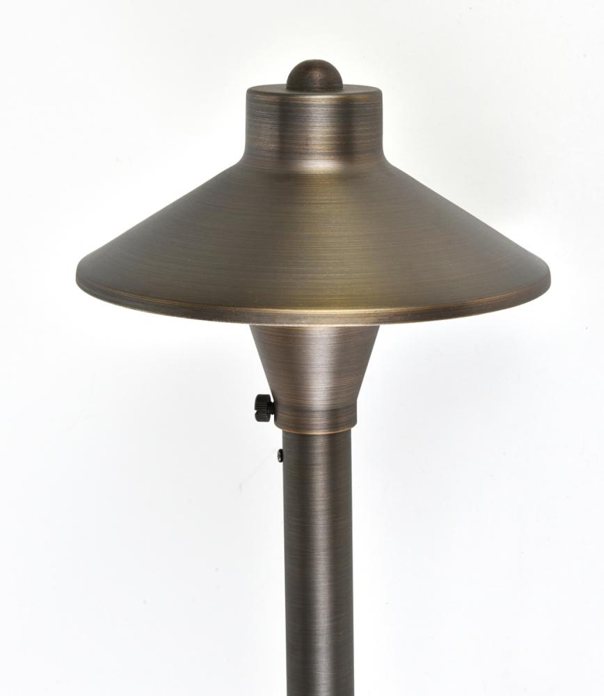 Inspired by the species of brightly-colored mushrooms, Chanterelle path lights create the perfect mood lighting for your evening stroll. The spinning brass frame in an antique-brass finish features an eight-inch spike for stability. with matching brass shade, the entire fixture stands 24 inches tall and requires a 20-watt G4 halogen bulb (not included). Ideal for brightening a dark driveway, front entrance, or a garden path.