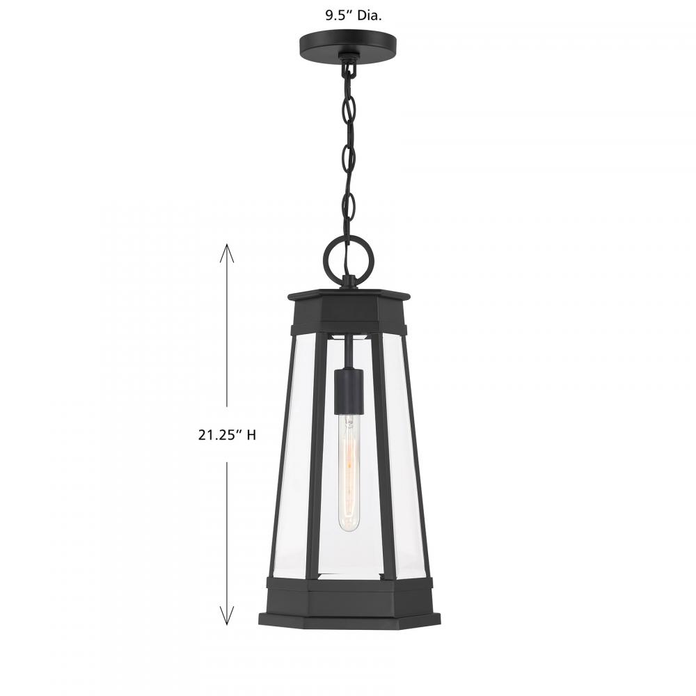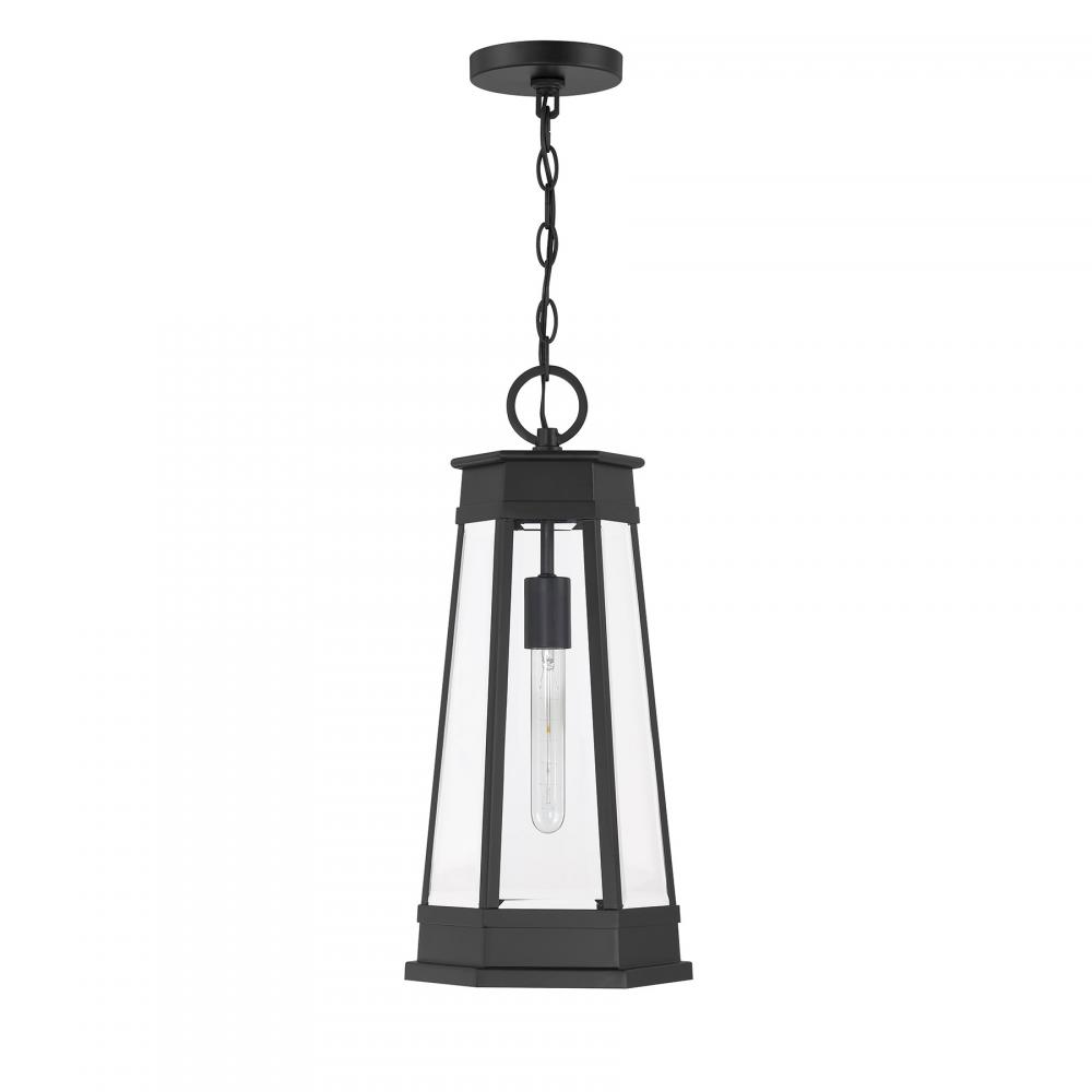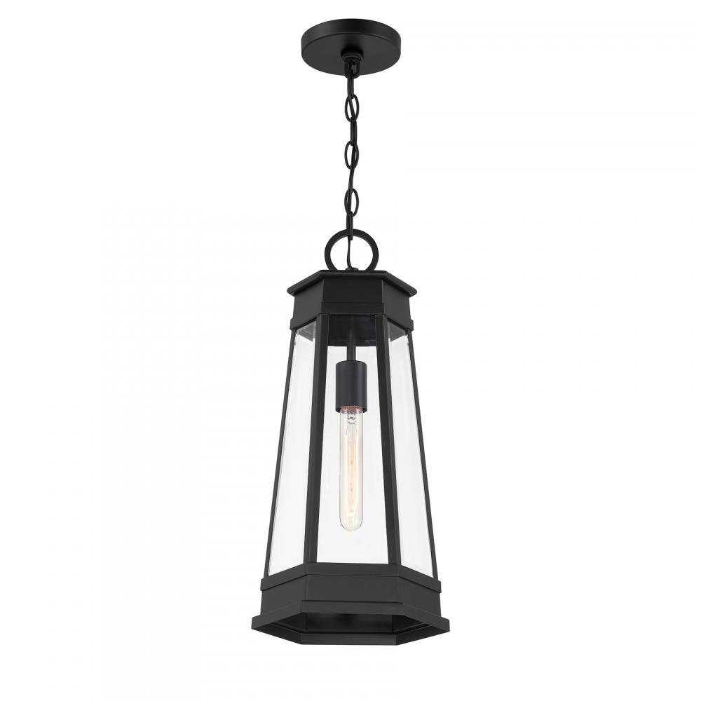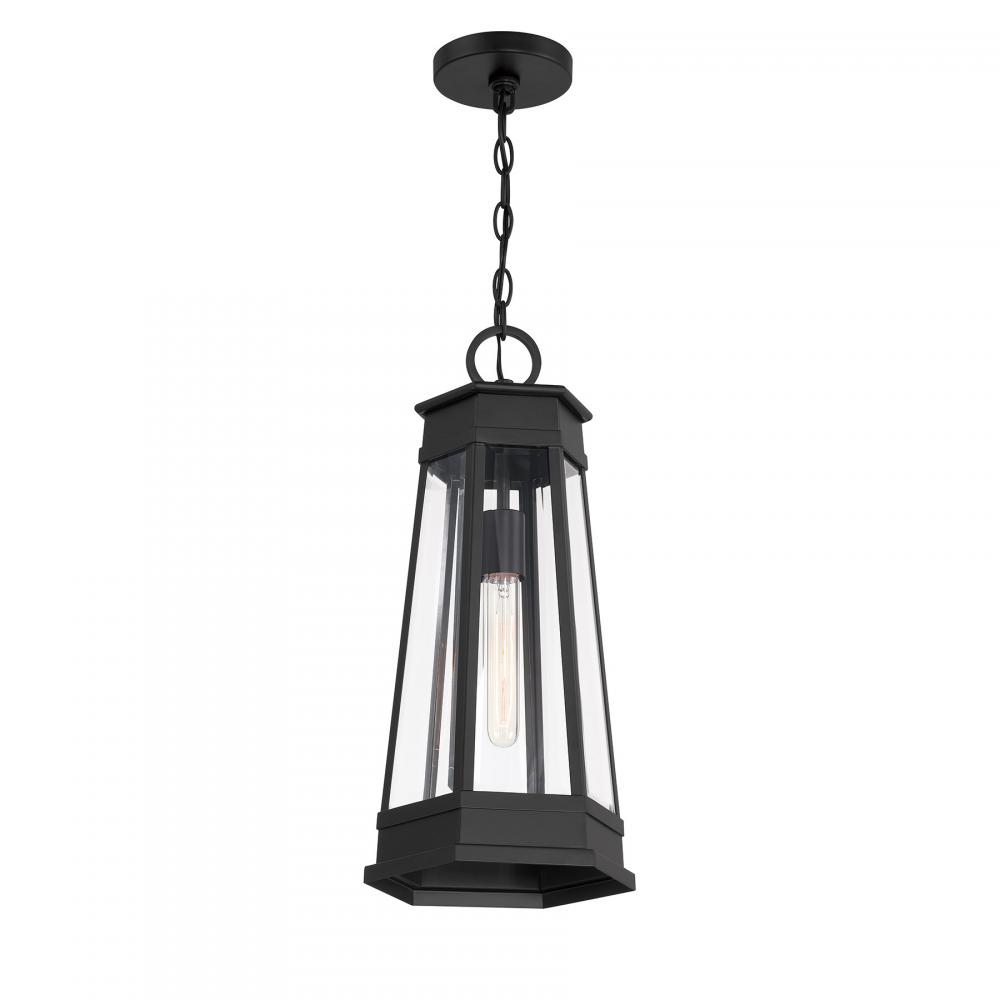 Light the way home with the terrific transitional style of the Savoy House Payne 1-light outdoor hanging light. It has standout style thanks to panes of clear beveled glass, thoughtful geometric detailing and a versatile Matte Black finish. Use it solo or in groupings to create a great first impression. Payne is 21.25" in height and 9.5" in width. Uses one standard size bulb of up to 60 watts. Bulb not included. Payne is damp area rated for use in covered outdoor areas.