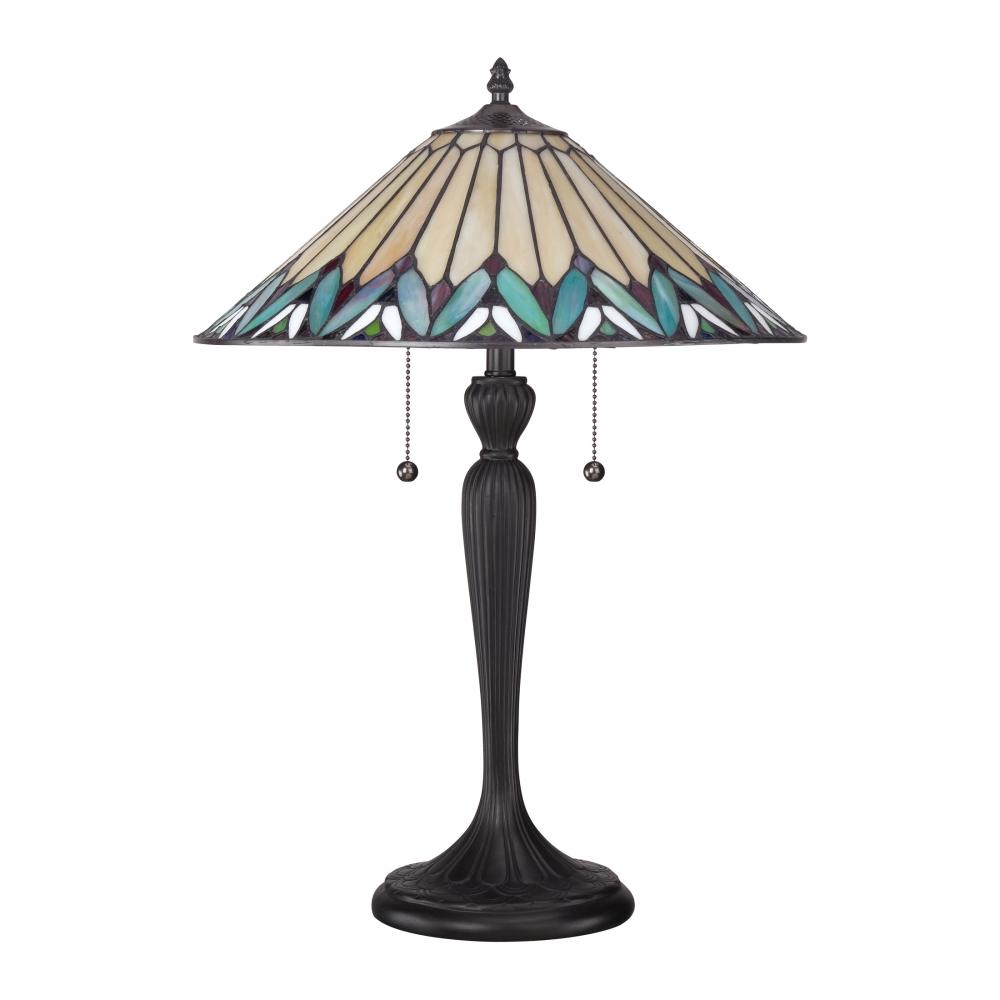 A delicate color palette distinguishes the Pearson table lamp featuring an Authentic Bronze patina and 240 pieces of Tiffany style art glass that have been hand assembled using the copper foil method developed by Louis Comfort Tiffany. It stands 23 inches