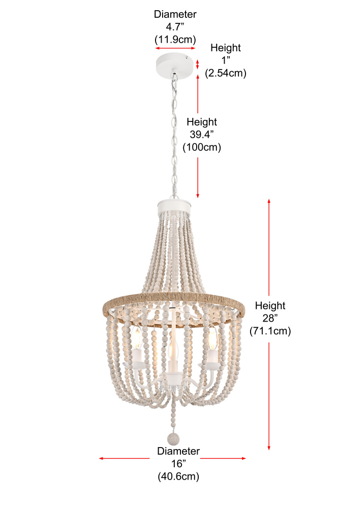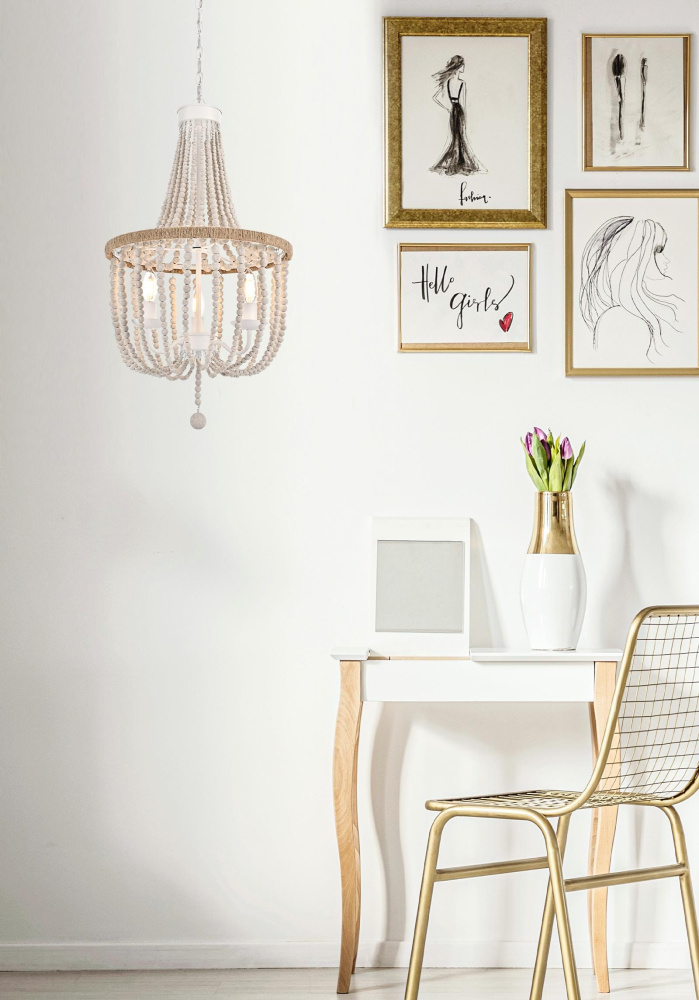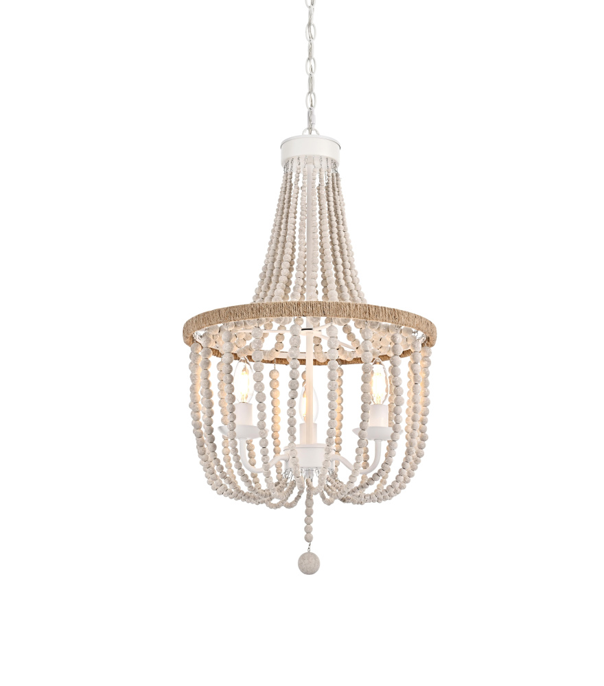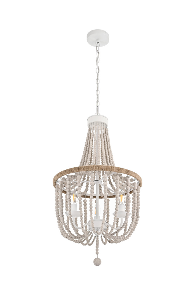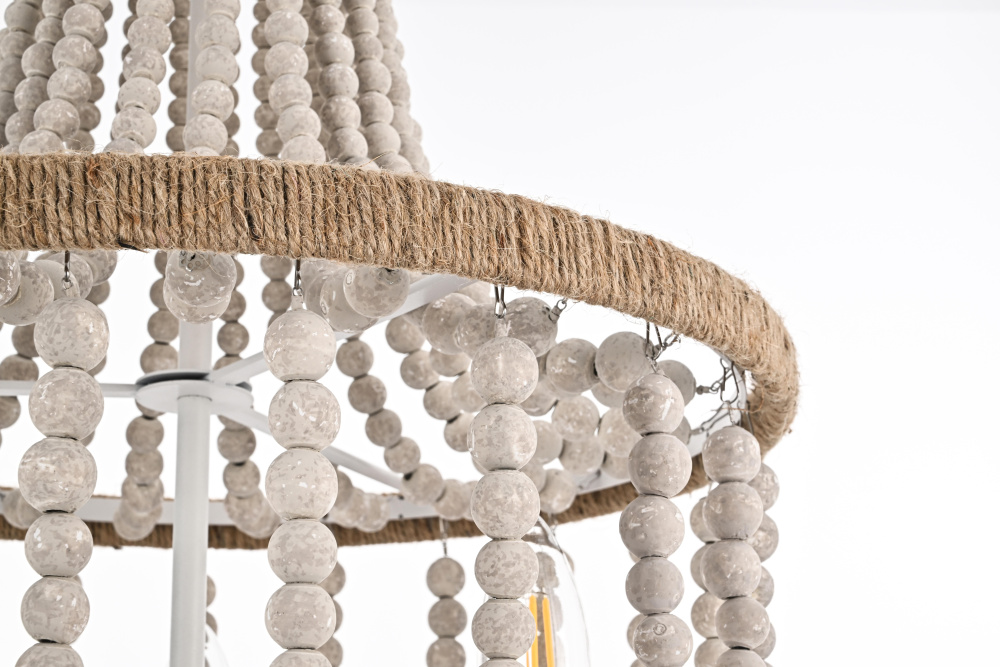 Elevate your space with this masterfully crafted pendant that artfully blends rustic charm with refined elegance. The dramatic cascading strands of wooden beads create a mesmerizing display of light and shadow, while the rope-wrapped crown adds an authentic touch of artisanal craftsmanship. Each piece showcases the natural beauty of carefully selected wooden beads, arranged in graceful loops that draw the eye upward and create a sense of gentle movement. The substantial iron framework ensures stability while maintaining an airy, elegant presence. Perfect for dining rooms, entryways, or living spaces, this versatile fixture adapts beautifully to various ceiling heights through its adjustable chain system. The three-light design provides ample illumination while creating enchanting patterns through the beaded strands. Whether styled in sophisticated antique white or warm natural beige, this pendant makes a striking statement while maintaining an organic, approachable presence. The thoughtful blend of materials and textures creates a piece that feels both timeless and fresh, making it an ideal choice for designers and homeowners seeking to create a space with both character and refinement.