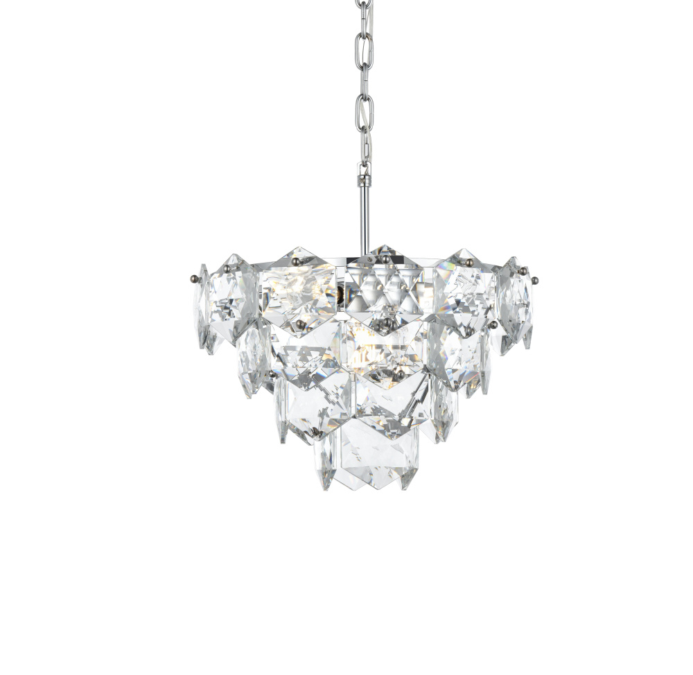 Transform your space with this cascading multi-tier pendant light that combines striking design with meticulous craftsmanship. Crafted from a sturdy iron frame and adorned with six-sided faceted crystals, this lighting piece exudes charm through its ability to diffuse light into a soft, radiant glow. With finishes available in both sleek chrome for a contemporary feel and satin gold for a warmer, refined touch, it complements a range of decor styles. The adjustable height, from 19 inches to 79 inches with the included 59-inch chain, ensures it fits seamlessly in any setting. Equipped with six E12 sockets and dimmable functionality, you can customize the lighting to suit your mood or occasion. Its matching canopy and chain finish complete the cohesive design, making it perfect for kitchens, dining rooms, living rooms, or offices. A statement piece that transforms your space into a work of art, this pendant is the perfect blend of style and functionality.