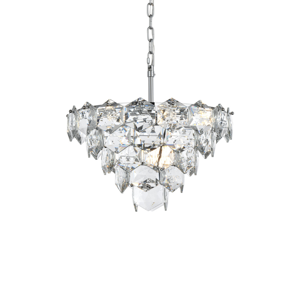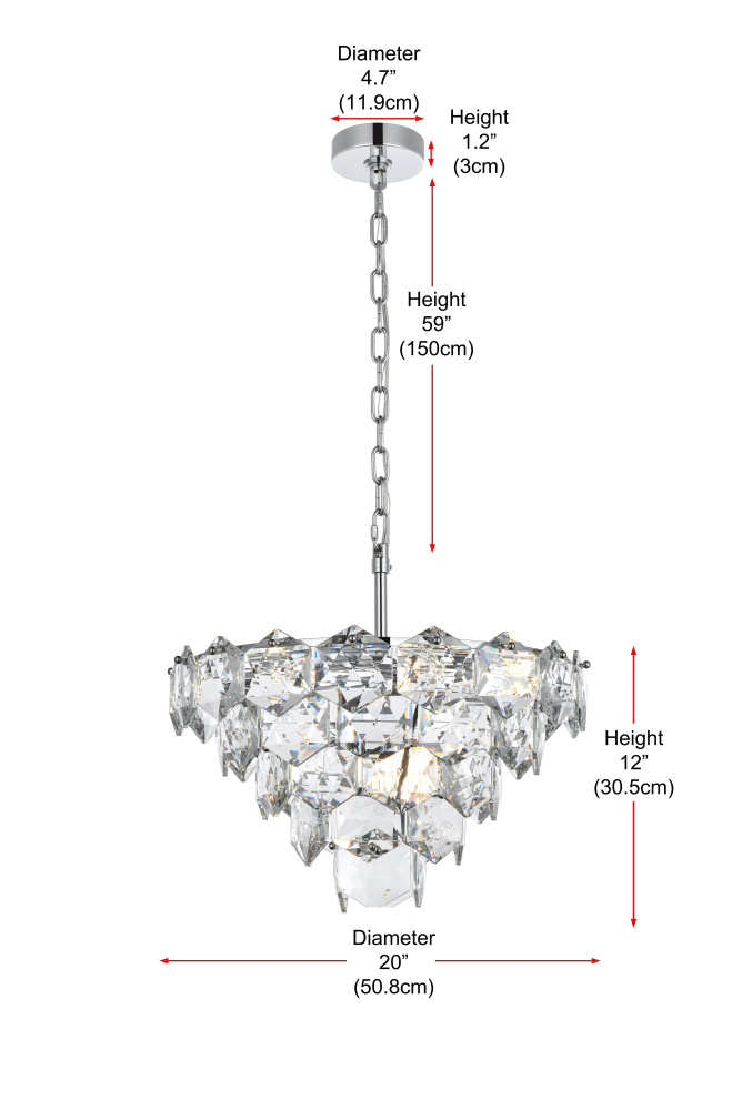 Transform your space with this cascading multi-tier pendant light that combines striking design with meticulous craftsmanship. Crafted from a sturdy iron frame and adorned with six-sided faceted crystals, this lighting piece exudes charm through its ability to diffuse light into a soft, radiant glow. With finishes available in both sleek chrome for a contemporary feel and satin gold for a warmer, refined touch, it complements a range of decor styles. The adjustable height, from 21 inches to 81 inches with the included 59-inch chain, ensures it fits seamlessly in any setting. Equipped with eight E12 sockets and dimmable functionality, you can customize the lighting to suit your mood or occasion. Its matching canopy and chain finish complete the cohesive design, making it perfect for kitchens, dining rooms, living rooms, or offices. A statement piece that transforms your space into a work of art, this pendant is the perfect blend of style and functionality.