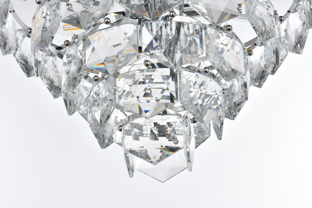 Features a stunning multi-tier arrangement of faceted crystals cascading down, creating a layered, dynamic visual effect that draws the eye and adds depth to any room.