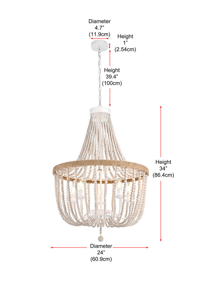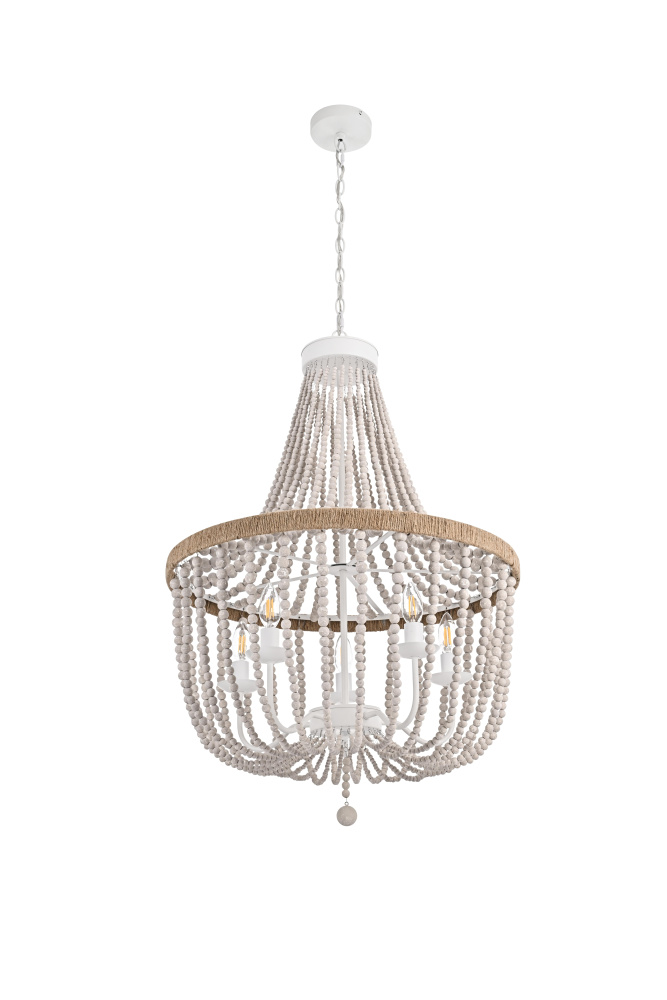 Elevate your space with this masterfully crafted pendant that artfully blends rustic charm with refined elegance. The dramatic cascading strands of wooden beads create a mesmerizing display of light and shadow, while the rope-wrapped crown adds an authentic touch of artisanal craftsmanship. Each piece showcases the natural beauty of carefully selected wooden beads, arranged in graceful loops that draw the eye upward and create a sense of gentle movement. The substantial iron framework ensures stability while maintaining an airy, elegant presence. Perfect for dining rooms, entryways, or living spaces, this versatile fixture adapts beautifully to various ceiling heights through its adjustable chain system. The three-light design provides ample illumination while creating enchanting patterns through the beaded strands. Whether styled in sophisticated antique white or warm natural beige, this pendant makes a striking statement while maintaining an organic, approachable presence. The thoughtful blend of materials and textures creates a piece that feels both timeless and fresh, making it an ideal choice for designers and homeowners seeking to create a space with both character and refinement.