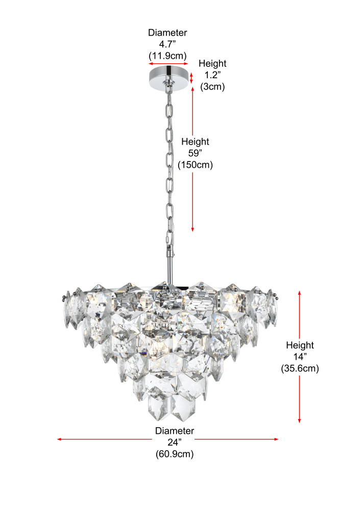 Transform your space with this cascading multi-tier pendant light that combines striking design with meticulous craftsmanship. Crafted from a sturdy iron frame and adorned with six-sided faceted crystals, this lighting piece exudes charm through its ability to diffuse light into a soft, radiant glow. With finishes available in both sleek chrome for a contemporary feel and satin gold for a warmer, refined touch, it complements a range of decor styles. The adjustable height, from 23 inches to 83 inches with the included 59-inch chain, ensures it fits seamlessly in any setting. Equipped with eleven E12 sockets and dimmable functionality, you can customize the lighting to suit your mood or occasion. Its matching canopy and chain finish complete the cohesive design, making it perfect for kitchens, dining rooms, living rooms, or offices. A statement piece that transforms your space into a work of art, this pendant is the perfect blend of style and functionality.