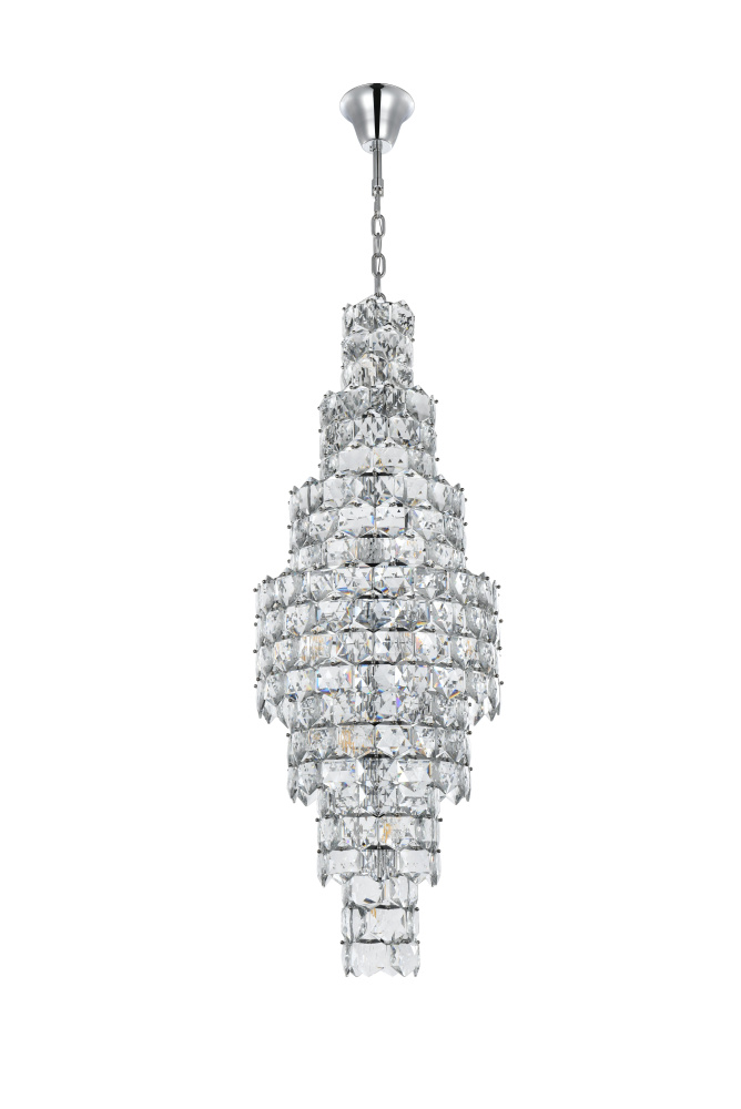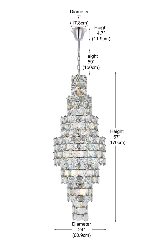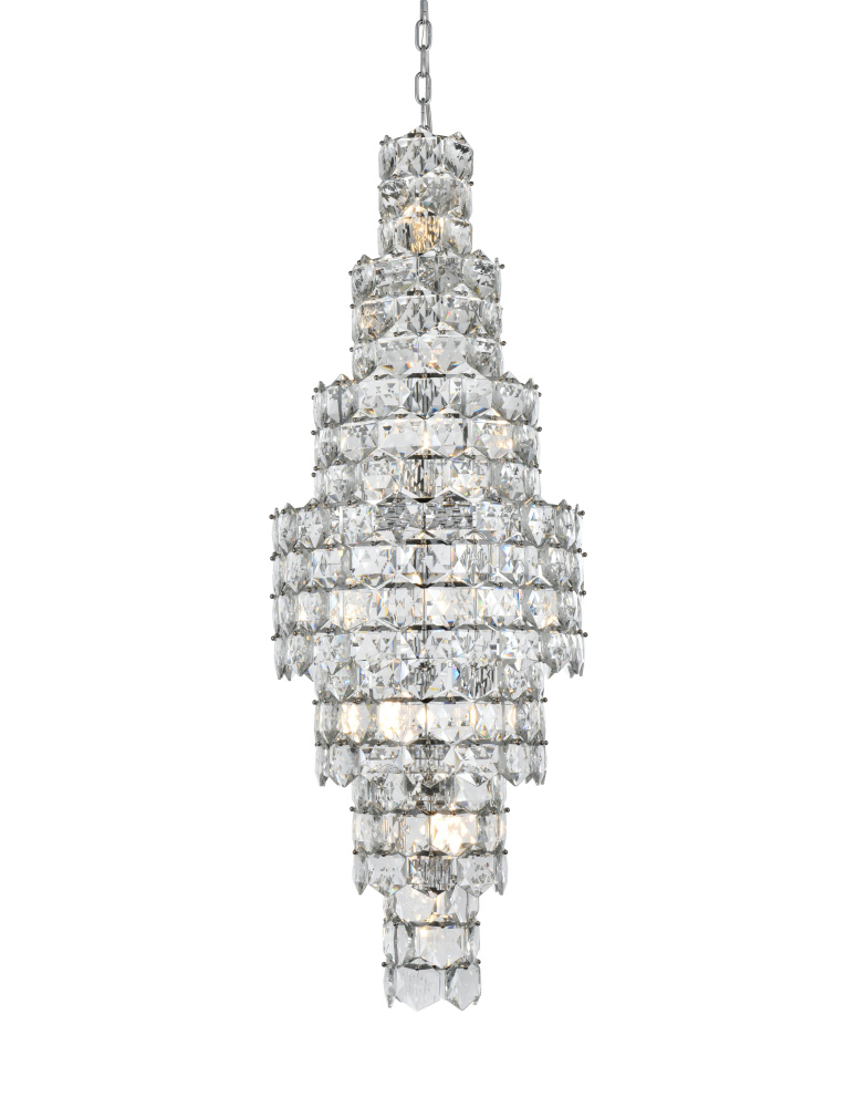 Transform your space with this spectacular crystal pendant that redefines modern luxury. The masterfully engineered design features ten graduating tiers that create a dramatic tapered silhouette, reminiscent of a frozen waterfall captured in mid-descent. Each precisely cut hexagonal crystal is strategically positioned to maximize light play, creating mesmerizing displays of fractured light and shadow throughout your space. The substantial scale and architectural presence make this fixture an ideal centerpiece for grand entryways, sophisticated dining rooms, or executive offices. The thoughtful construction incorporates 26 light sources distributed throughout the tiers, ensuring both spectacular illumination and enchanting crystal animation. The robust iron framework provides a secure foundation while maintaining visual lightness, allowing the crystals to appear as if floating in space. Whether styled in reflective chrome or warm satin gold, this pendant makes an unforgettable statement while maintaining sophisticated restraint. The cascading arrangement creates a sense of movement and flow, while the geometric precision of each crystal adds contemporary edge to the classical form. This is more than a light fixture – it's an architectural feature that transforms your space through its commanding presence and spectacular light performanc