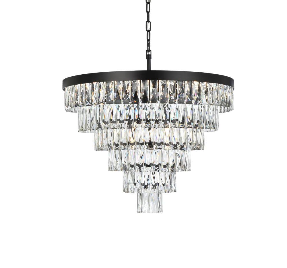 Transform your space with this extraordinary pendant that reimagines classical crystal design for contemporary interiors. The masterfully engineered silhouette features six graduating tiers that create a spectacular inverted pyramid, reminiscent of a frozen cascade captured in mid-descent. Each precisely cut rectangular crystal is strategically positioned to maximize light play, creating mesmerizing displays of fractured light throughout your space. The substantial scale makes this fixture an ideal centerpiece for grand entryways, sophisticated dining rooms, or executive offices. The thoughtful construction incorporates 13 light sources distributed throughout the tiers, ensuring both spectacular illumination and enchanting crystal animation. The robust iron framework provides a secure foundation while maintaining visual lightness, allowing the crystals to appear as if floating in space. Available in reflective chrome, sophisticated black, or warm satin gold, this pendant makes an unforgettable statement while maintaining refined restraint. The cascading arrangement creates a sense of movement and flow, while the geometric precision of each crystal adds contemporary edge to the classical form. This is more than a light fixture – it's an architectural feature that transforms your space through its commanding presence and spectacular light performanc