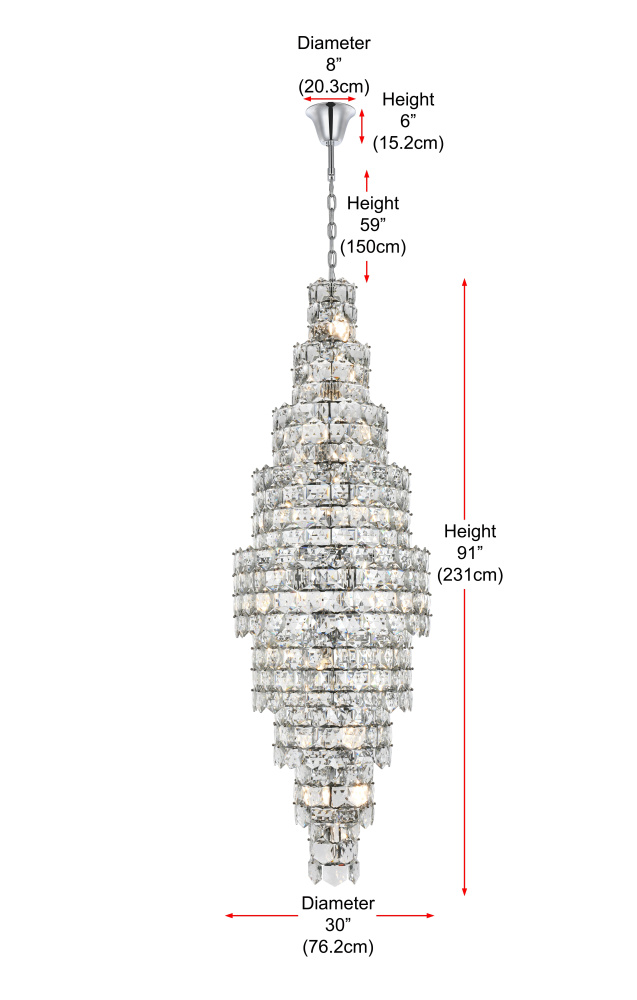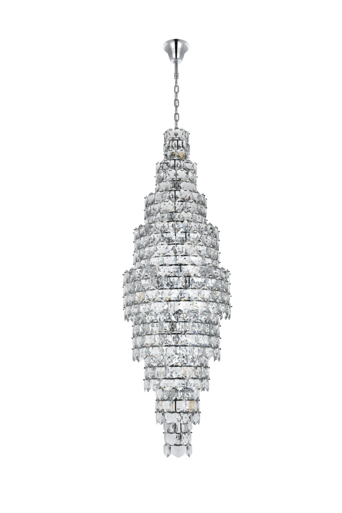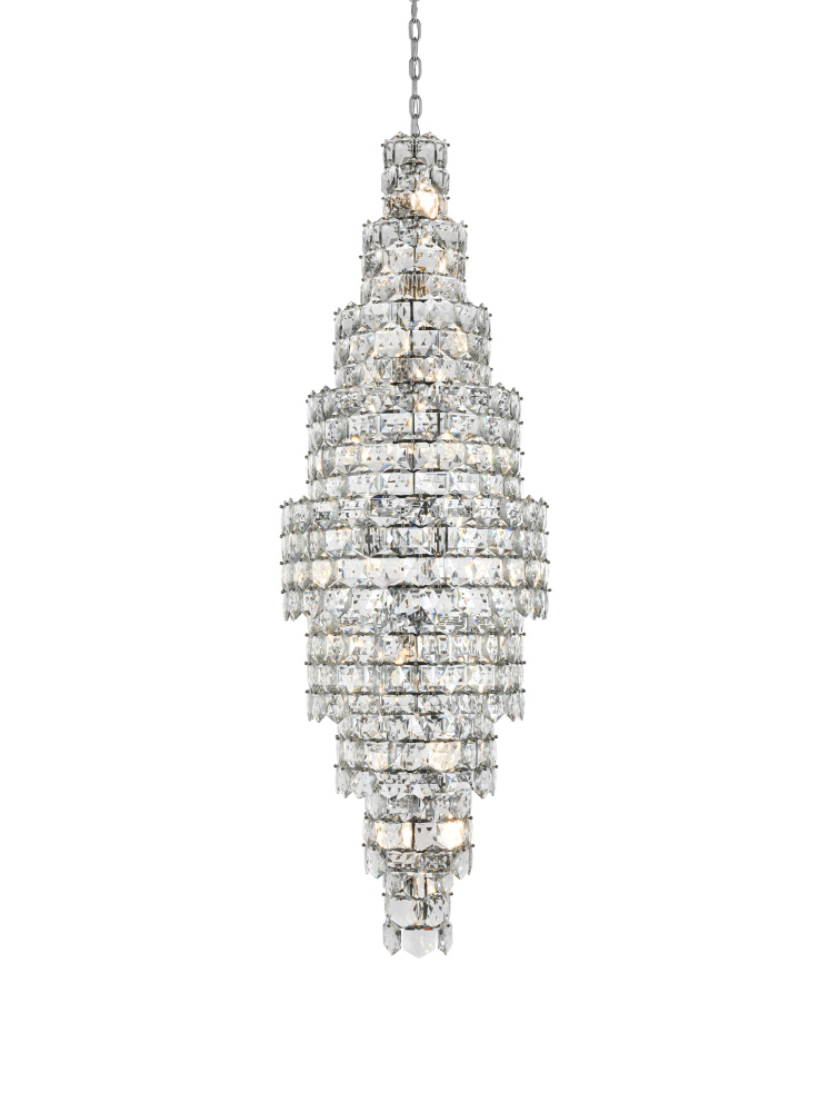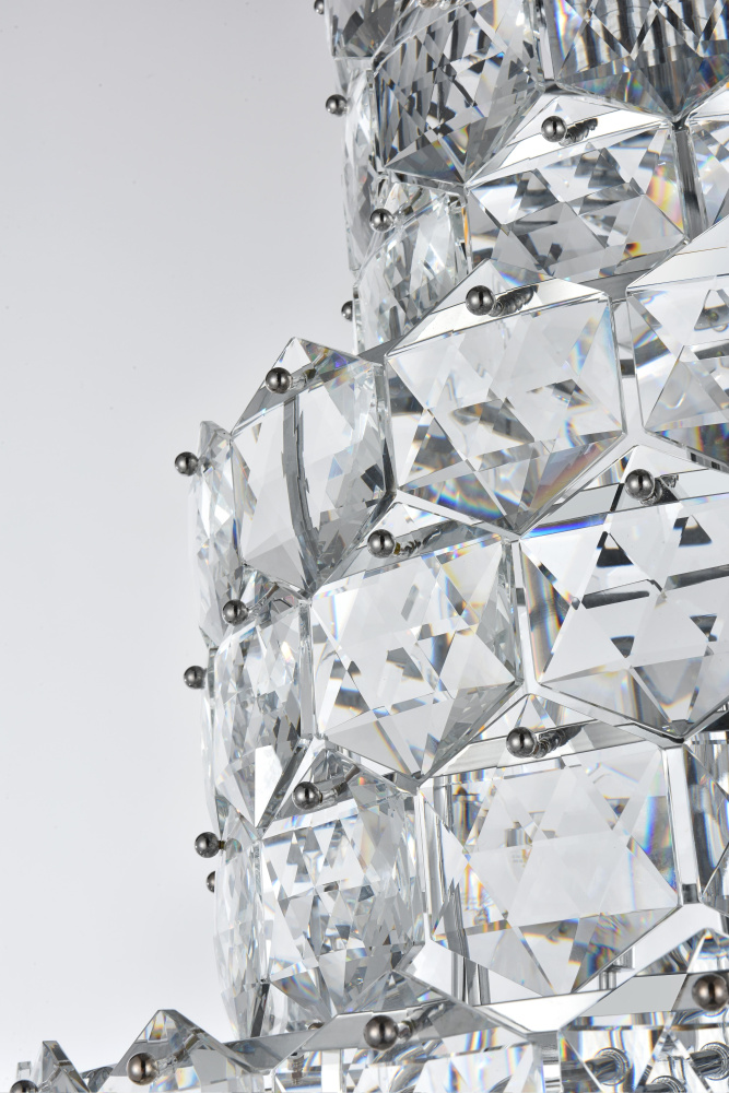 Transform your space with this spectacular crystal pendant that redefines modern luxury. The masterfully engineered design features ten graduating tiers that create a dramatic tapered silhouette, reminiscent of a frozen waterfall captured in mid-descent. Each precisely cut hexagonal crystal is strategically positioned to maximize light play, creating mesmerizing displays of fractured light and shadow throughout your space. The substantial scale and architectural presence make this fixture an ideal centerpiece for grand entryways, sophisticated dining rooms, or executive offices. The thoughtful construction incorporates 41 light sources distributed throughout the tiers, ensuring both spectacular illumination and enchanting crystal animation. The robust iron framework provides a secure foundation while maintaining visual lightness, allowing the crystals to appear as if floating in space. Whether styled in reflective chrome or warm satin gold, this pendant makes an unforgettable statement while maintaining sophisticated restraint. The cascading arrangement creates a sense of movement and flow, while the geometric precision of each crystal adds contemporary edge to the classical form. This is more than a light fixture – it's an architectural feature that transforms your space through its commanding presence and spectacular light performanc