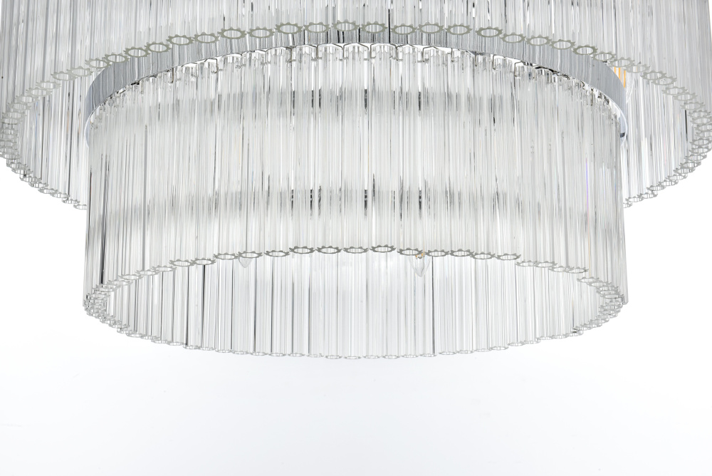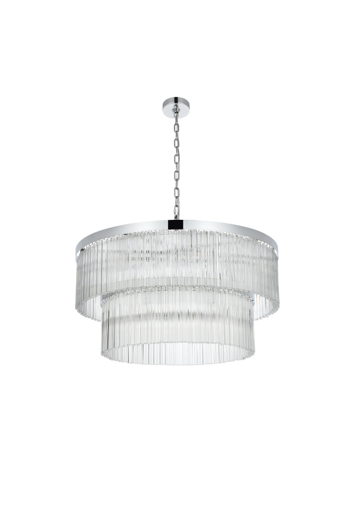 Turn your space into a glowing masterpiece with this striking pendant light, crafted from durable iron and shimmering clear ribbed glass. The cascading layers create a stunning interplay of light and shadow, refracting illumination into a radiant display that transforms your space into an illuminated work of art. Available in chrome for a sleek, contemporary aesthetic, black for bold contrast, and satin gold for an inviting warmth, this pendant light is as versatile as it is beautiful. Whether you choose a single tier for minimalist charm, two tiers for balanced depth, three tiers for bold presence, or four tiers for show-stopping grandeur, there’s an option for every setting. Featuring both round and rectangular frame designs, this fixture adapts to any space with ease. Complete with a matching canopy and chain, and fully dimmable for customized lighting, this pendant pairs perfectly with the coordinating single-tier flush mount and wall sconce collection, ensuring a cohesive, radiant design throughout youhome or office. Please note: light bulbs are sold separately.