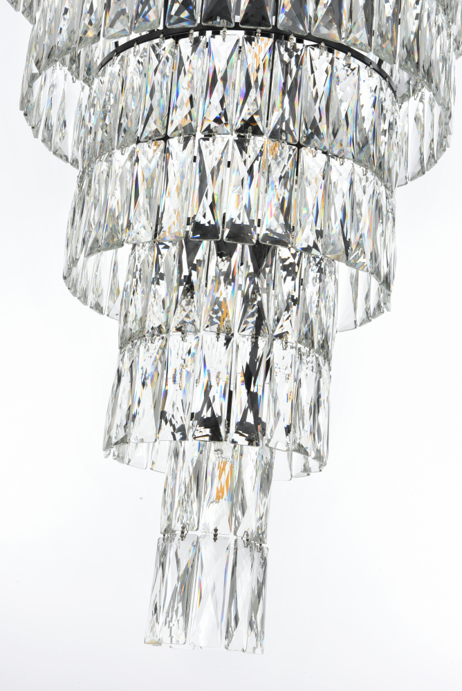 Transform your space with this extraordinary pendant that reimagines classical crystal design for contemporary interiors. The masterfully engineered silhouette features seven graduating tiers that create a spectacular inverted pyramid, reminiscent of a frozen cascade captured in mid-descent. Each precisely cut rectangular crystal is strategically positioned to maximize light play, creating mesmerizing displays of fractured light throughout your space. The substantial scale makes this fixture an ideal centerpiece for grand entryways, sophisticated dining rooms, or executive offices. The thoughtful construction incorporates 41 light sources distributed throughout the tiers, ensuring both spectacular illumination and enchanting crystal animation. The robust iron framework provides a secure foundation while maintaining visual lightness, allowing the crystals to appear as if floating in space. Available in reflective chrome, sophisticated black, or warm satin gold, this pendant makes an unforgettable statement while maintaining refined restraint. The cascading arrangement creates a sense of movement and flow, while the geometric precision of each crystal adds contemporary edge to the classical form. This is more than a light fixture – it's an architectural feature that transforms your space through its commanding presence and spectacular light performanc