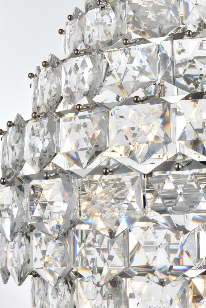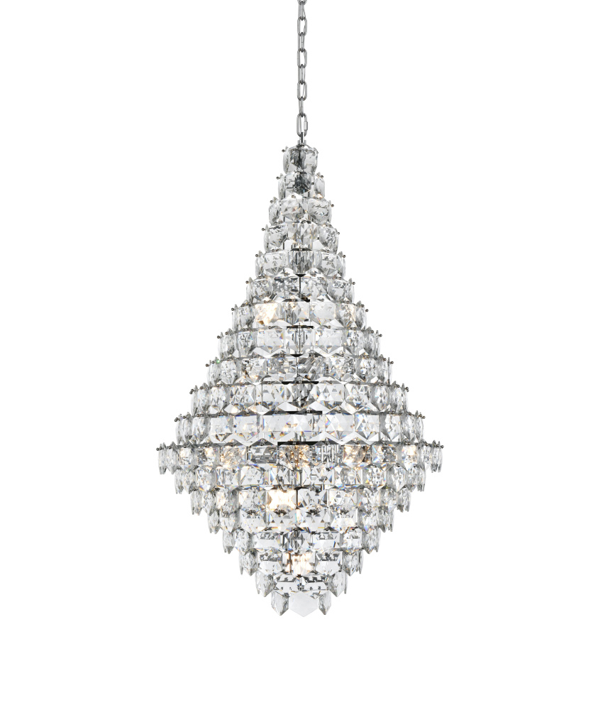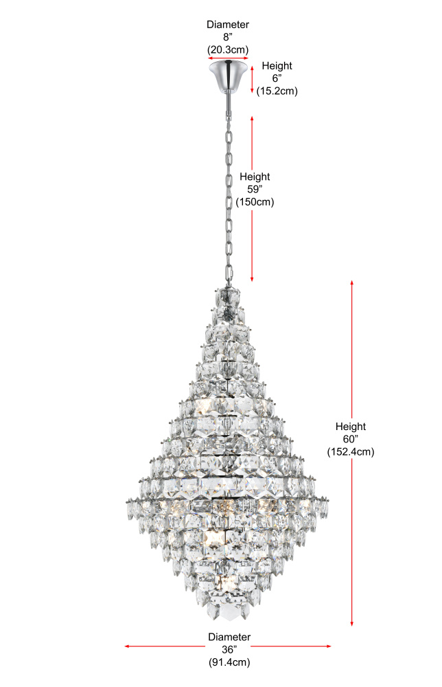Make a bold statement with this stunning teardrop-shaped pendant light that combines architectural form with radiant details. The cascading multi-tier arrangement of six-sided faceted crystals creates a dazzling visual effect, beautifully diffusing light to enhance the ambiance of any room. Built with a durable iron frame and available in chrome for a sleek, contemporary edge or satin gold for a rich, inviting tone, this lighting fixture complements a range of decor styles. Its grand adjustable hanging height—from 75 inches to 135 inches—makes it ideal for spaces with high ceilings. With 38 E12 sockets (bulbs sold separately) and dimmable compatibility, it provides versatile lighting options tailored to your needs. The matching canopy and chain finish complete its cohesive design. Whether placed in a dining room, living room, office, or a grand foyer, this chandelier-style pendant transforms any space into a brilliant masterpi