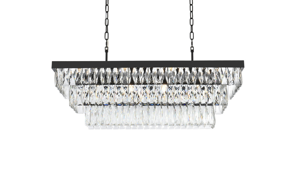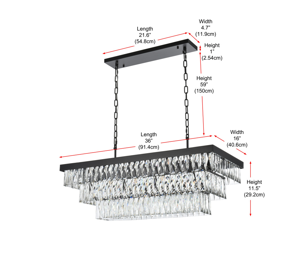 Transform your space with this spectacular linear pendant that reinvents crystal lighting for contemporary interiors. The bold rectangular frame suspends two perfectly proportioned crystal tiers, creating a mesmerizing interplay of light and structure. Each precisely cut crystal is strategically positioned to maximize light play, producing brilliant refractions that dance across your space. The strong horizontal presence makes this fixture an ideal centerpiece above dining tables, conference rooms, or in grand living spaces. The thoughtful construction marries industrial strength with crystalline delicacy, as the robust metal frame appears to float above while supporting the spectacular crystal arrangement. Whether styled in reflective chrome, sophisticated black, or warm satin gold, this pendant commands attention through its architectural presence. The linear composition offers a fresh interpretation of crystal lighting, where clean lines and geometric precision meet the spectacular light performance of premium crystal. This fixture doesn't merely illuminate – it defines space through its commanding horizontal presence while creating an ever-changing display of light and shado