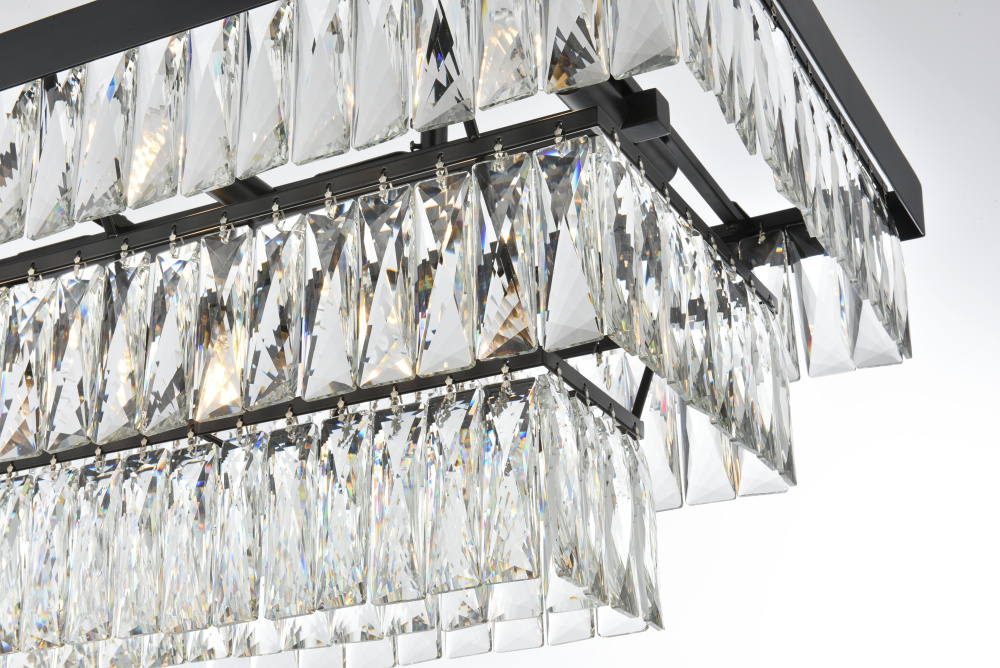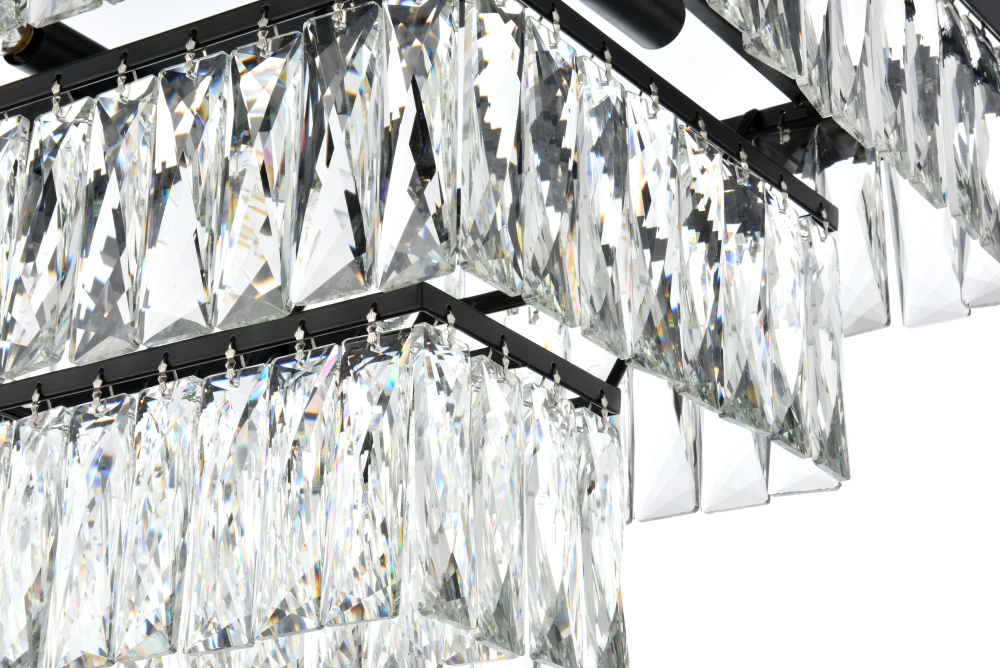 The rectangular frame creates a bold horizontal statement while crystal tiers cascade in perfect symmetry.