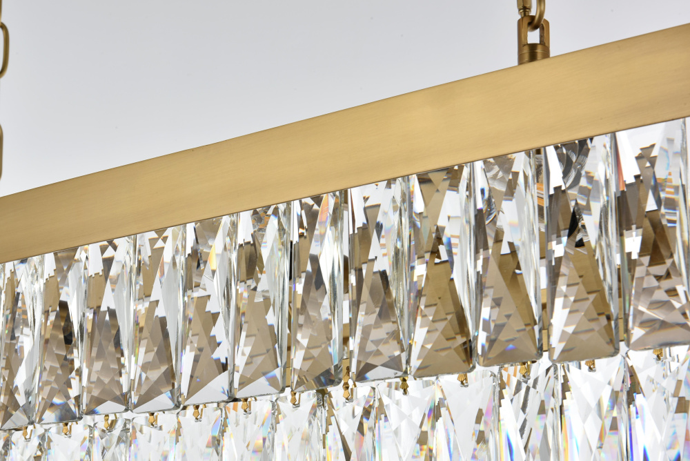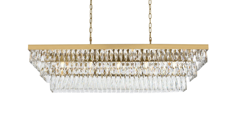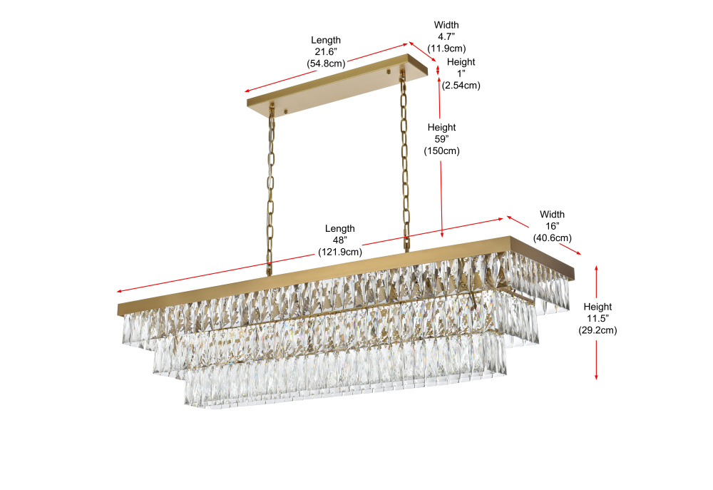 Transform your space with this spectacular linear pendant that reinvents crystal lighting for contemporary interiors. The bold rectangular frame suspends two perfectly proportioned crystal tiers, creating a mesmerizing interplay of light and structure. Each precisely cut crystal is strategically positioned to maximize light play, producing brilliant refractions that dance across your space. The strong horizontal presence makes this fixture an ideal centerpiece above dining tables, conference rooms, or in grand living spaces. The thoughtful construction marries industrial strength with crystalline delicacy, as the robust metal frame appears to float above while supporting the spectacular crystal arrangement. Whether styled in reflective chrome, sophisticated black, or warm satin gold, this pendant commands attention through its architectural presence. The linear composition offers a fresh interpretation of crystal lighting, where clean lines and geometric precision meet the spectacular light performance of premium crystal. This fixture doesn't merely illuminate – it defines space through its commanding horizontal presence while creating an ever-changing display of light and shado