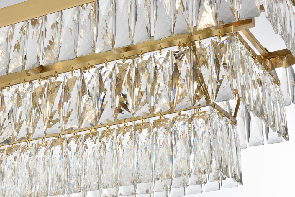 The rectangular frame creates a bold horizontal statement while crystal tiers cascade in perfect symmetry.