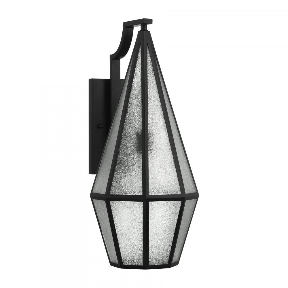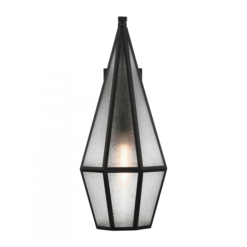 Decorate your great outdoors with the highly glamorous Savoy House Peninsula 1-light outdoor wall lantern. Its tall, slim, diamond-like design showcases panes of art glass that obscure the light within and create lots of eye-catching texture. Matte Black finish. Peninsula is 24" in height, 10" in width and extends 13.5" from the wall. Uses one standard size bulb of up to 60 watts. The bulb is not included. Wet area rated.