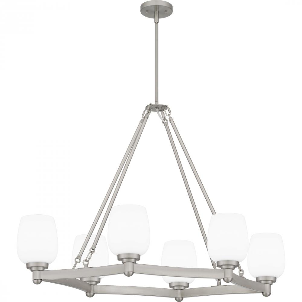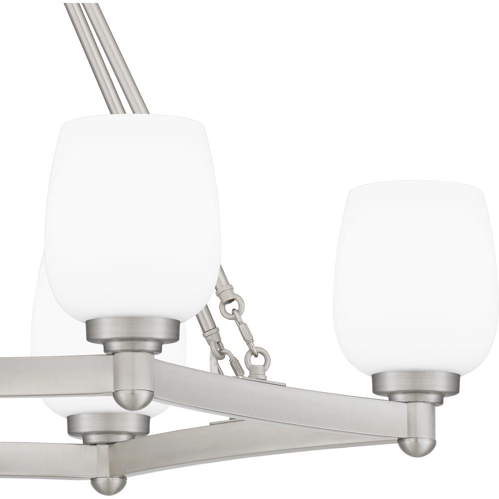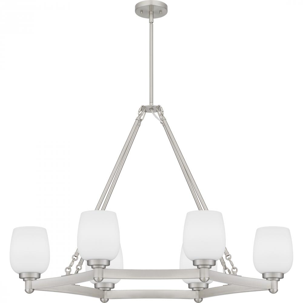 A fresh interpretation of the classic wagon wheel silhouette, Penning features opal etched glass shades that softly cast light. Whether in brushed nickel or matte black, the Penning chandelier delivers on updated traditional style. Hang this chandelier or