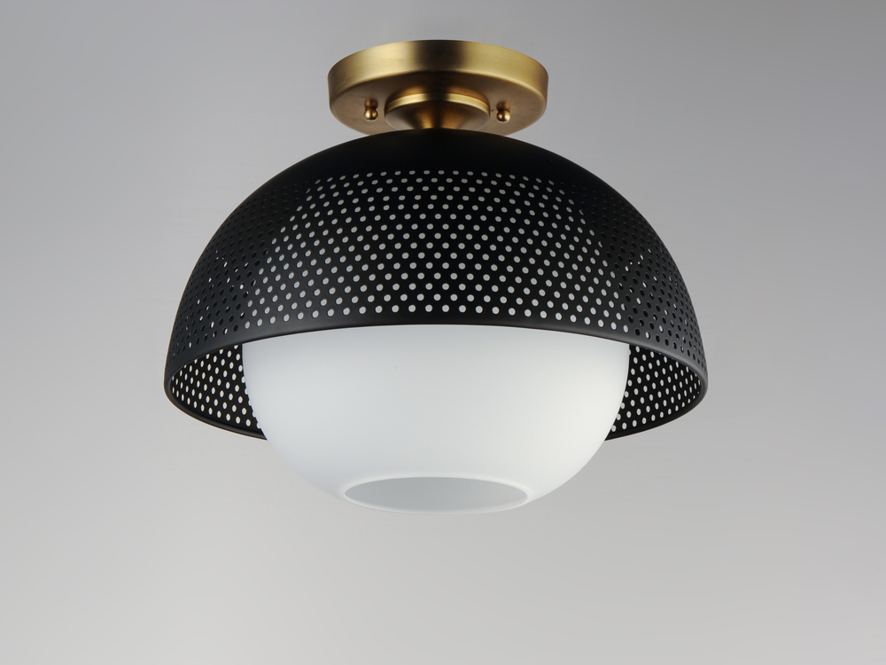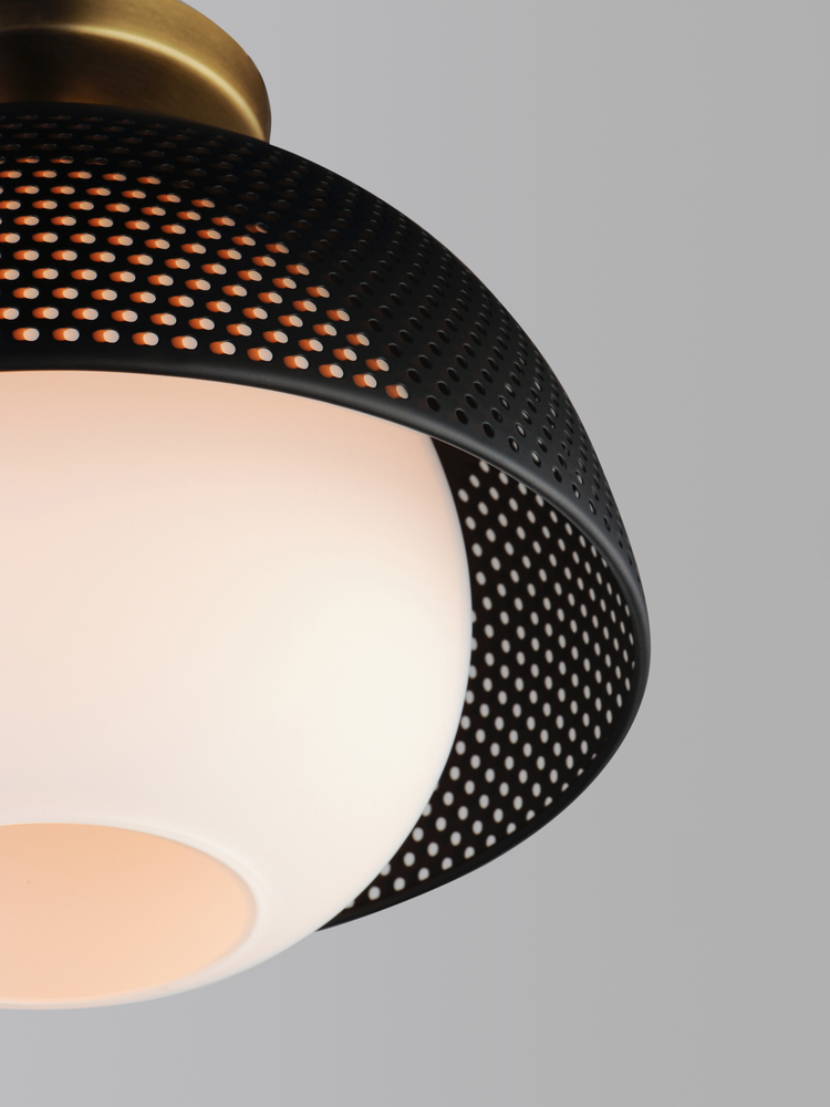 The Perf Pendant features a spherical glass shade housed within a matte Black perforated metal shade with Satin Brass accents. The blown glass globe provides pleasant surface diffusion while casting an optimal level of downlight. The additional metal spun