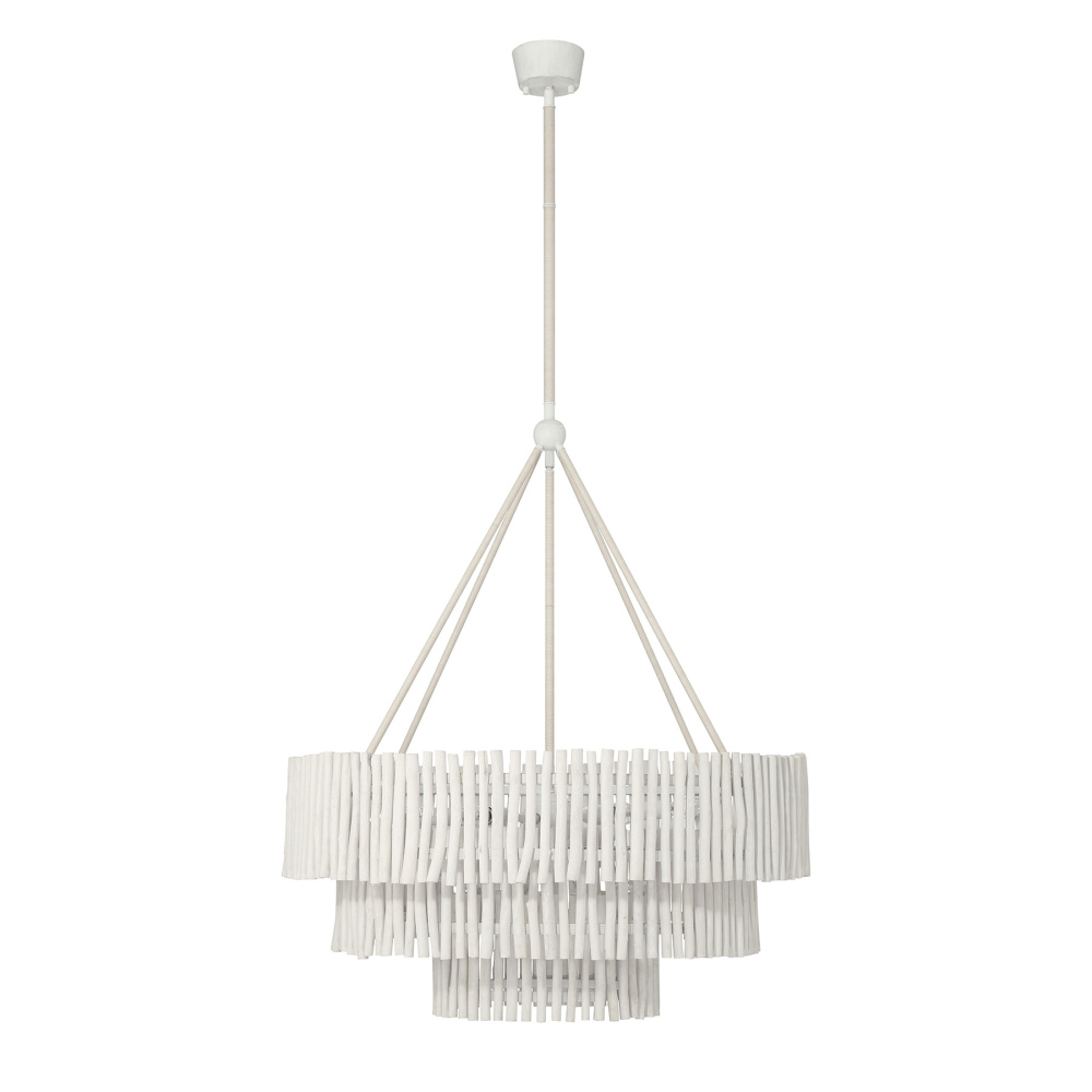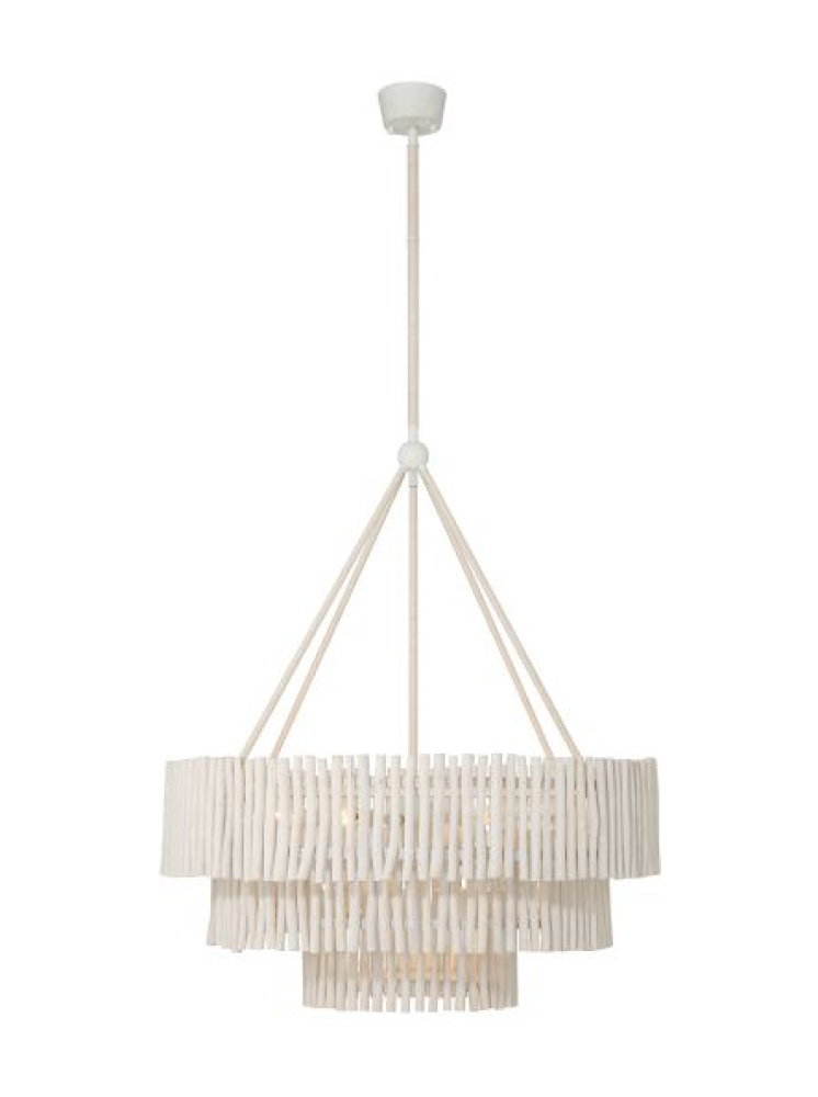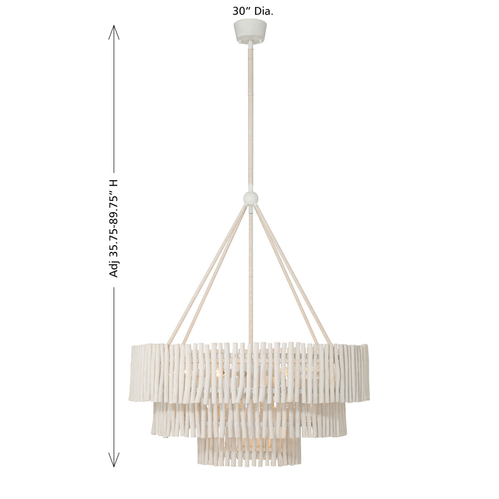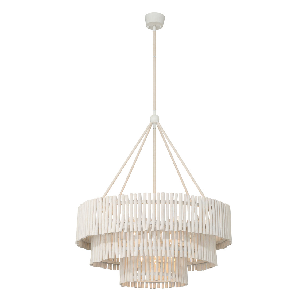 The Savoy House Phong 9-light chandelier was designed by award-winning interior designer and TV host Breegan Jane. Raised in California and now living in Ibiza, Breegan brings her love of seaside living into every detail of this design. Three tiers of white-washed wood embrace the perfect imperfection of organic materials, radiating a breezy, relaxed coastal mood. The Blanco finish enhances that easygoing warmth. Phong is 30" wide and has an adjustable height ranging from 35.75" to 89.75". It uses nine candelabra size bulbs of up to 60 watts per bulb. Bulbs not included. Comes with four 12" downrods and one 6" downrod.