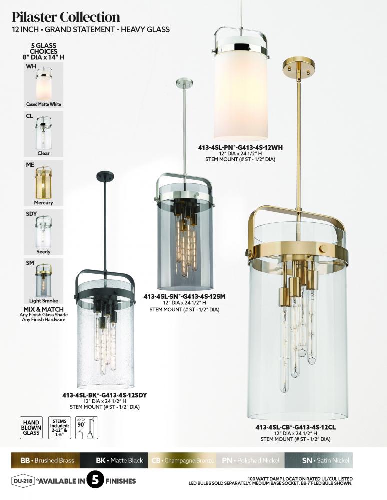 Pilaster - 4 Light - 12 inch glass - Brushed Brass - Clear Shade - Stem hung - Pendant
