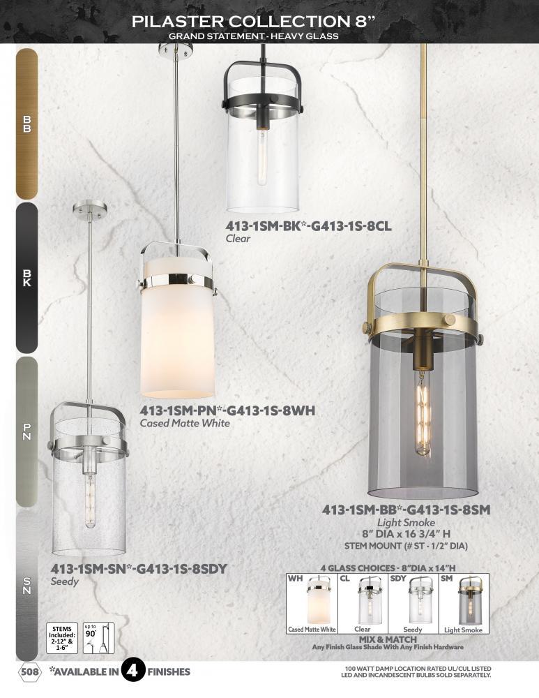 Innovations Lighting 413-1S-SN-8CL - Pilaster - 1 Light - 8 inch Glass - Brushed Satin Nickel - Stem hung - Mini Pendant