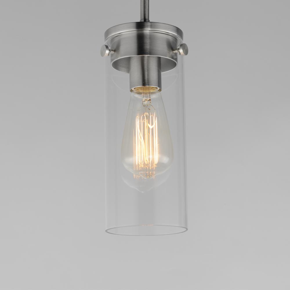 Simple clear glass cylinders are secured by decorative thumb screws in this transitional collection of sconces and pendants both neutral in design and suitable for damp applications. Choose from Satin Nickel or a two-tone Black and Satin Brass finish to pa