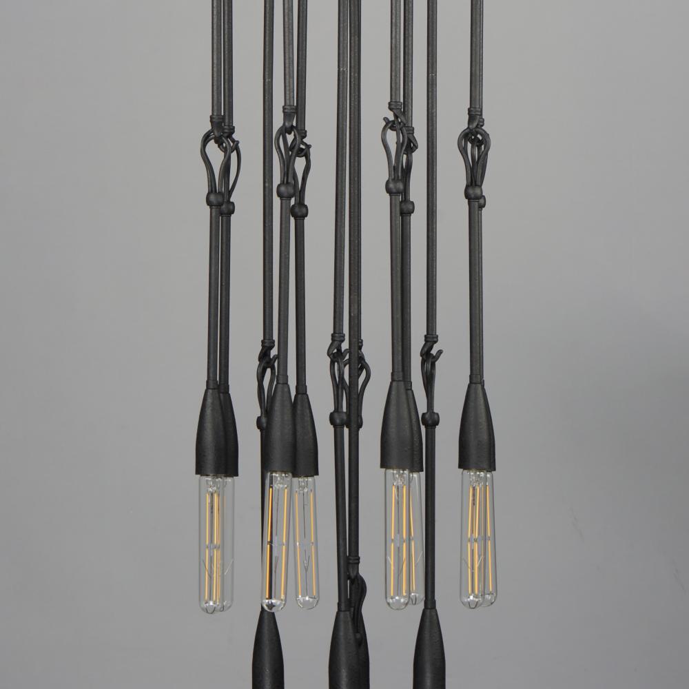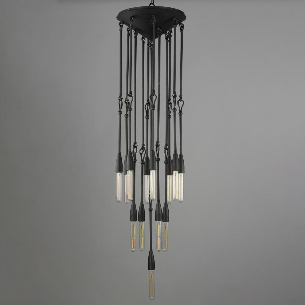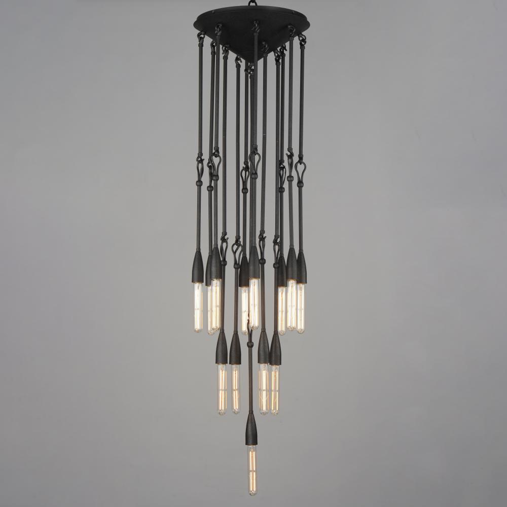 Simple with rustic elements, elongated rods are tiered with a forged iron hook and loop detail in multiple configurations. The fixtures' textured Anthracite finish enhances the artistry of the forged iron construction. Available in multi-pendant config