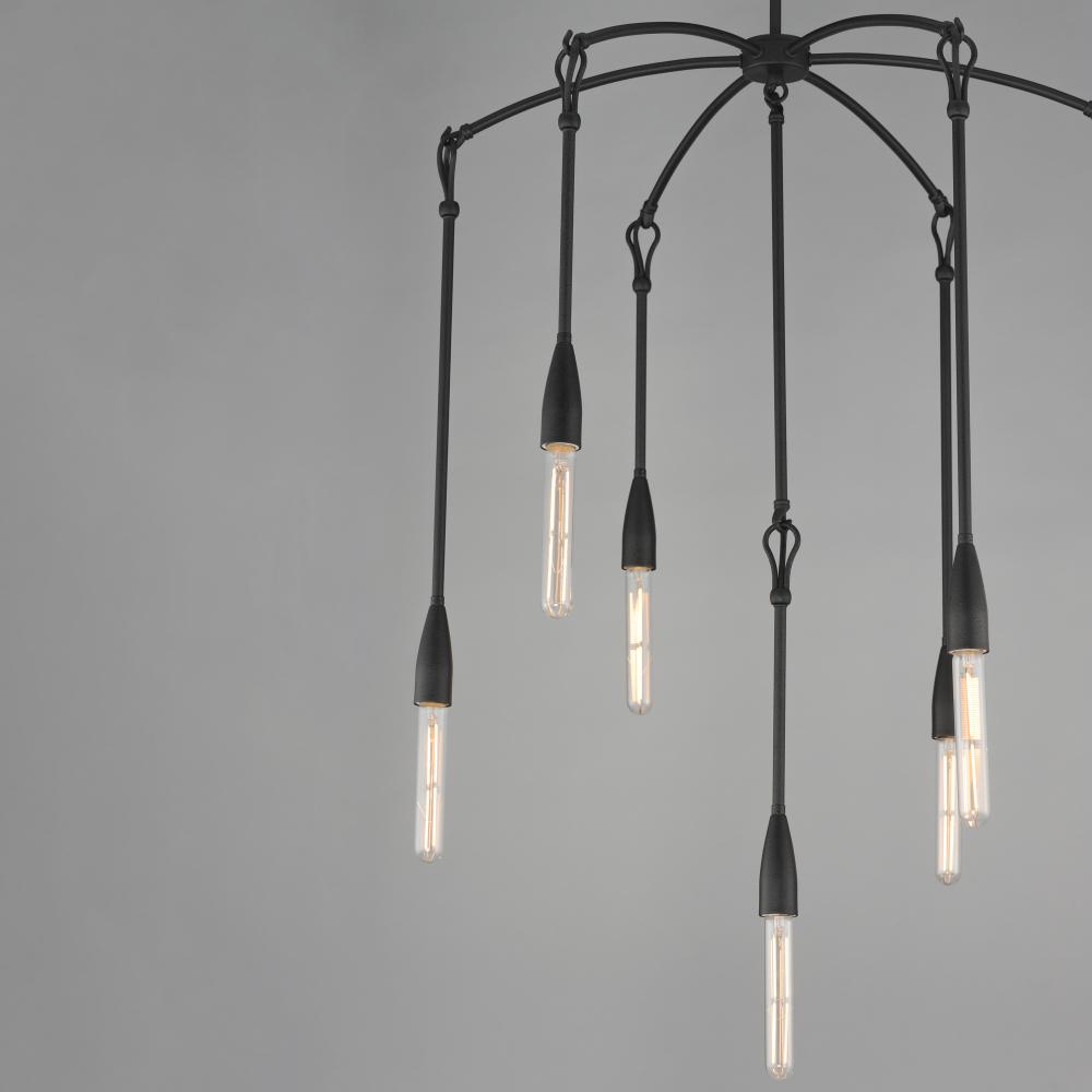 Simple with rustic elements, elongated rods are tiered with a forged iron hook and loop detail in multiple configurations. The fixtures' textured Anthracite finish enhances the artistry of the forged iron construction. Available in multi-pendant config