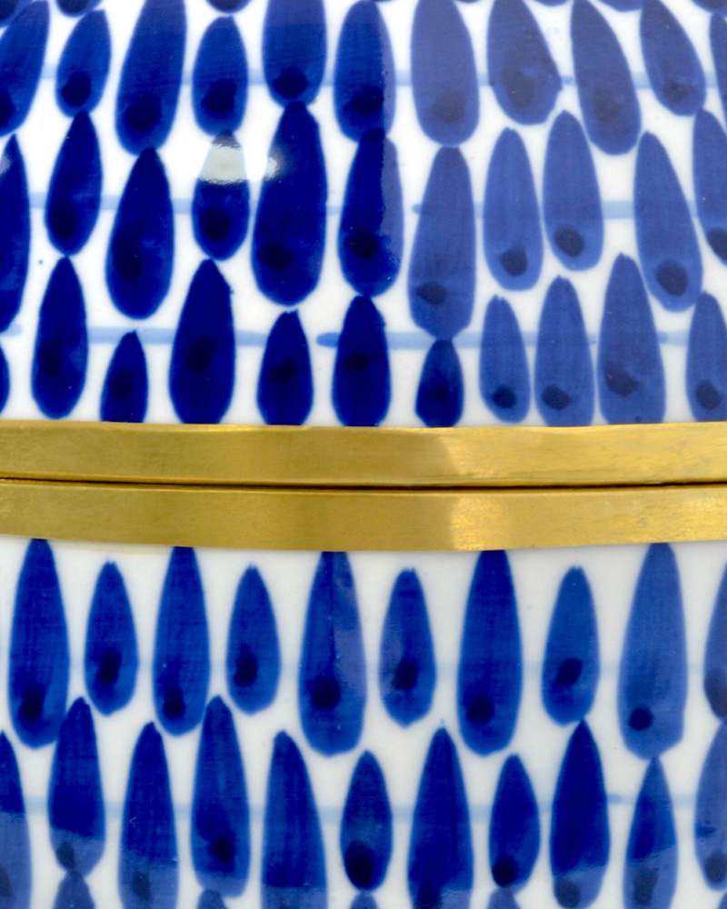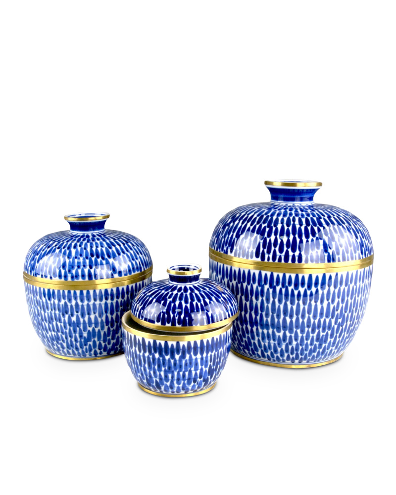 The Plavan Jar Set includes three lidded offering boxes with luminous brass rings running the circumference of the bottom, the top, and along each edge where the lid meets the jar. The electric blue pattern that seems to drip along the surface of each jar is actually painted by hand. Proving that these pieces are artisanal in their creation, some brushstrokes show the culmination point where the artist lifted the brush on the lighter oblong shapes, the action leaving a darker spot at that point. Though these blue decorative jars were inspired by centuries-old designs, they have a surprisingly contemporary feel.